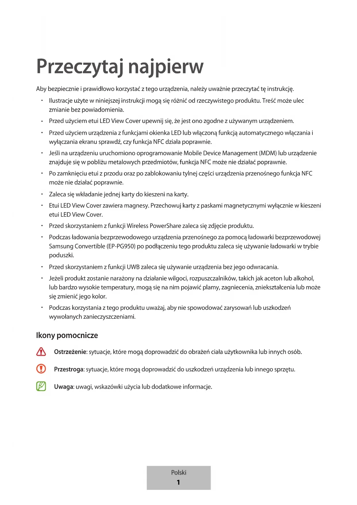 Podczas korzystania z tego produktu uważaj, aby nie spowodować zarysowań lub uszkodzeń wywołanych zanieczyszczeniami. Ikony pomocnicze Ostrzeżenie: sytuacje, które mogą doprowadzić do obrażeń ciała użytkownika lub innych osób. Przestroga: sytuacje, które mogą doprowadzić do uszkodzeń urządzenia lub innego sprzętu. Uwaga: uwagi, wskazówki użycia lub dodatkowe informacje. Polski