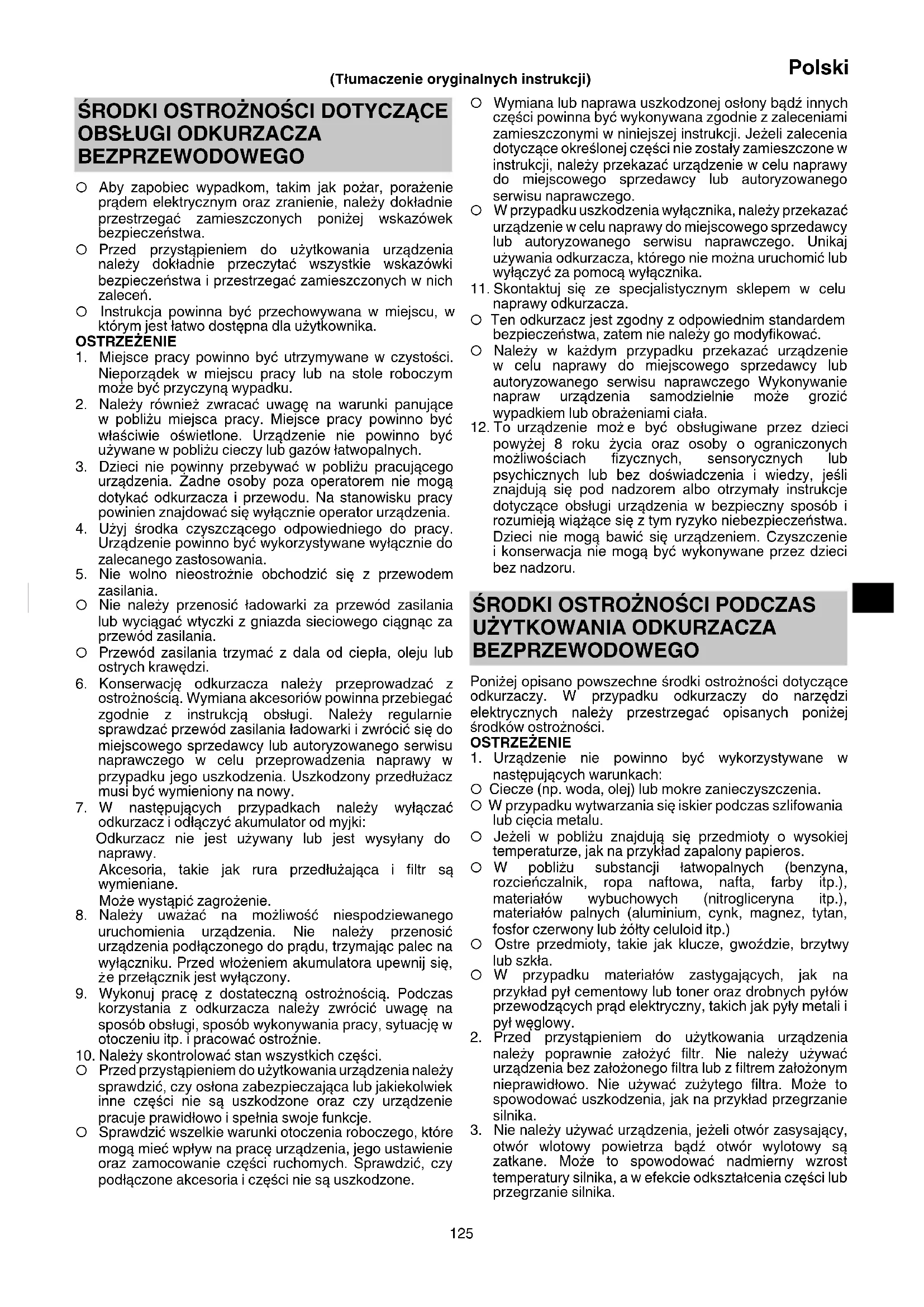 BEZPRZEWODOWEGO Poniżej opisano powszechne środki ostrożności dotyczące odkurzaczy. W przypadku odkurzaczy do narzędzi elektrycznych należy przestrzegać opisanych poniżej środków ostrożności. OSTRZEŻENIE