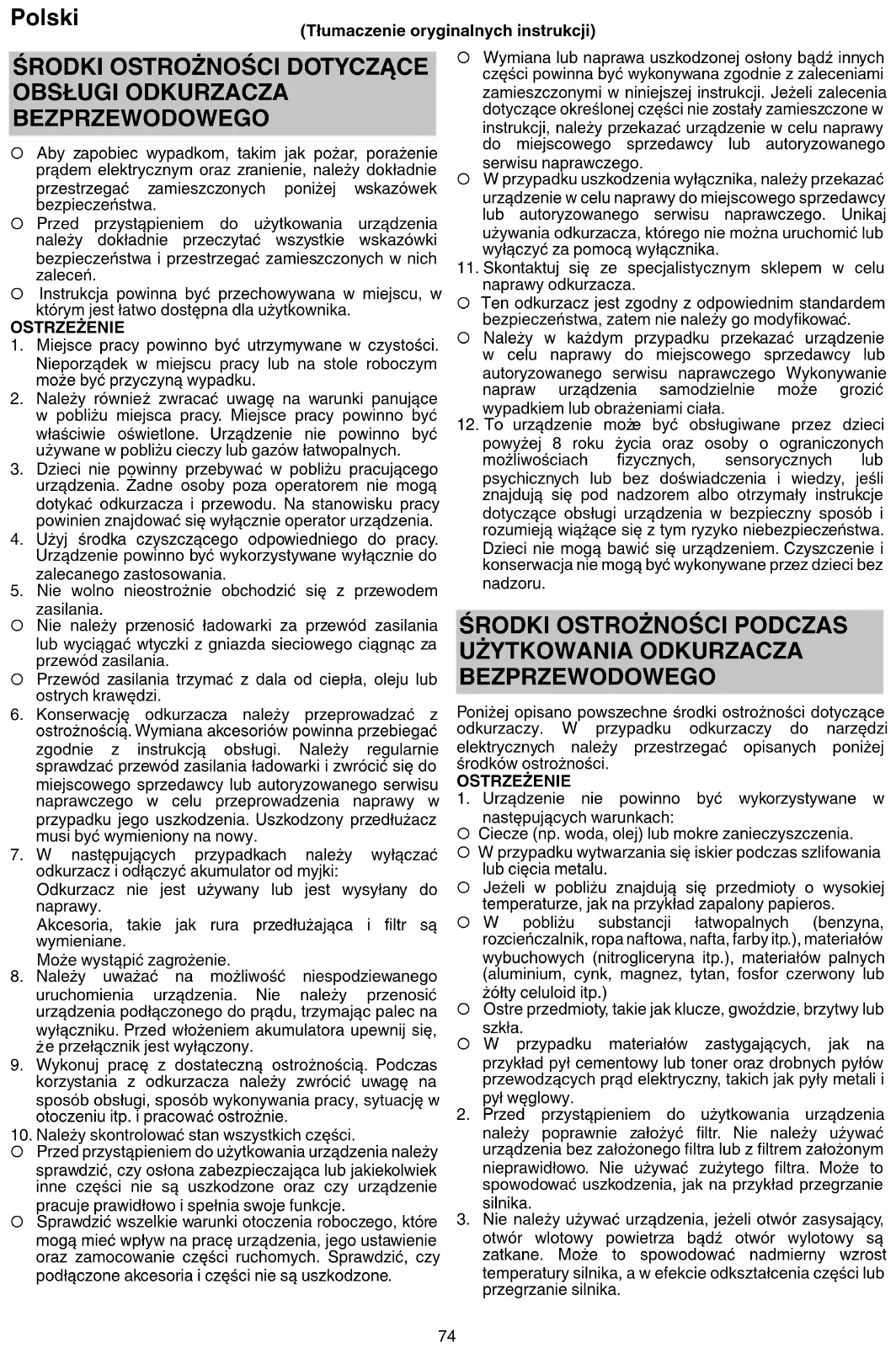 BEZPRZEWODOWEGO Poniżej opisano powszechne środki ostrożności dotyczące odkurzaczy. W przypadku odkurzaczy do narzędzi elektrycznych należy przestrzegać opisanych poniżej środków ostrożności. OSTRZEŻENIE