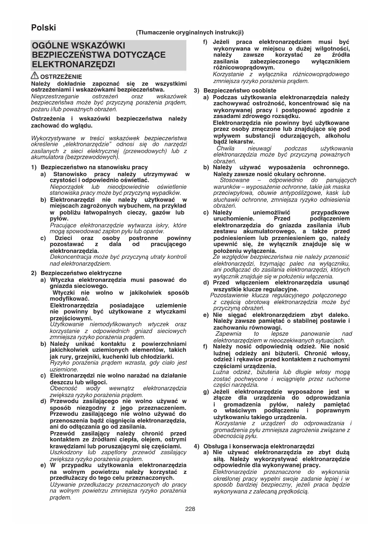 ELEKTRONARZĘDZI OSTRZEŻENIE Należy dokładnie zapoznać się ze wszystkimi ostrzeżeniami i wskazówkami bezpieczeństwa. Nieprzestrzeganie ostrzeżeń oraz wskazówek bezpieczeństwa może być przyczyną porażenia prądem, pożaru i/lub poważnych obrażeń. Ostrzeżenia i wskazówki bezpieczeństwa należy zachować do wglądu. Wykorzystywane w treści wskazówek bezpieczeństwa określenie „elektronarzędzie” odnosi się do narzędzi zasilanych z sieci elektrycznej (przewodowych) lub z akumulatora (bezprzewodowych).