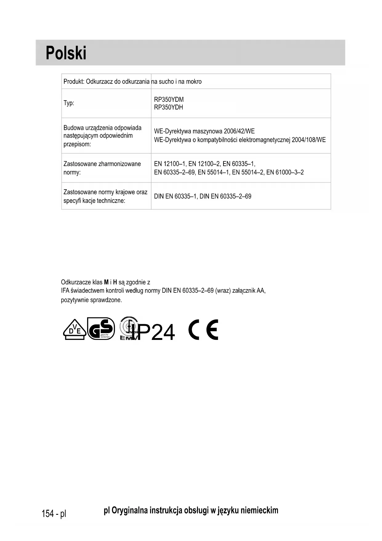 ▶Odkurzacze klasy H przystosowane są do odkurzania suchych, niepalnych pyłów, rakotwórczych oraz chorobotwórczych cząstek jak również niepalnych cieczy, pyłu drzewnego i pyłów niebezpiecznych ze wszystkich dopuszczalnych wartości narażenia zawodowego. ▶Odkurzacze klasy L nadają się do stosowania do suchych, niepalnych, zagrażających zdrowiu pyłów przy wartościach granicznych odniesionych do miejsca pracy > 1 mg/m³. 000BookRP350YDM.indb156000BookRP350YDM.indb156 2019/10/267:31:212019/10/267:31:21pl - 157