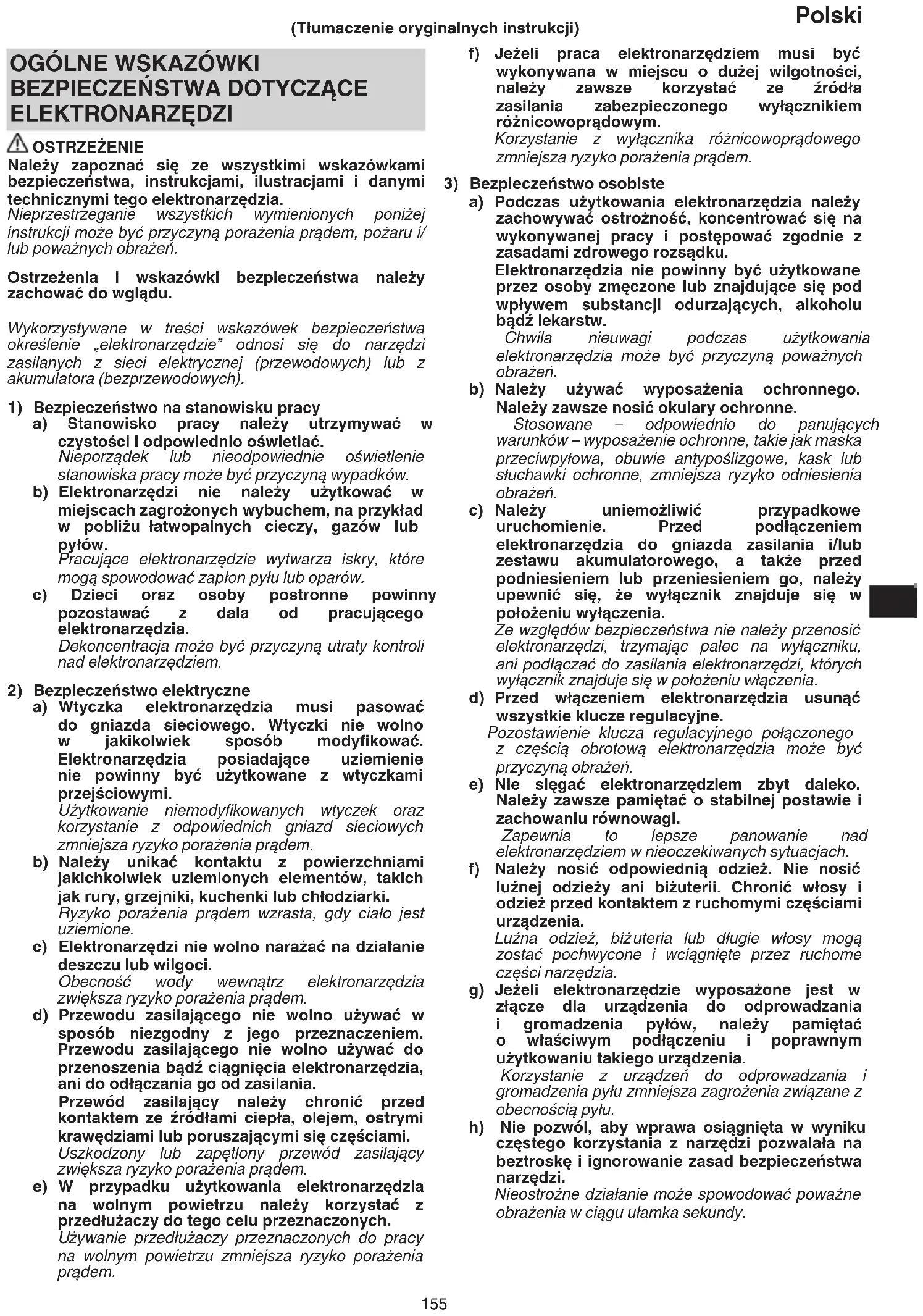 a) Podczas użytkowania elektronarzędzia należy zachowywać ostrożność, koncentrować się na wykonywanej pracy i postępować zgodnie z zasadami zdrowego rozsądku. Elektronarzędzia nie powinny być użytkowane przez osoby zmęczone lub znajdujące się pod wpływem substancji odurzających, alkoholu bądź lekarstw. Chwila nieuwagi podczas użytkowania elektronarzędzia moż e być przyczyną poważnych obrażeń. b) Należy używać wyposażenia ochronnego. Należy zawsze nosić okulary ochronne. Stosowane – odpowiednio do panujących warunków – wyposażenie ochronne, takie jak maska przeciwpyłowa, obuwie antypoślizgowe, kask lub słuchawki ochronne, zmniejsza ryzyko odniesienia obrażeń. c) Należy uniemożliwić przypadkowe uruchomienie. Przed podłączeniem elektronarzędzia do gniazda zasilania i/lub zestawu akumulatorowego, a także przed podniesieniem lub przeniesieniem go, należy upewnić się, że wyłącznik znajduje się w położeniu wyłączenia. Ze względów bezpieczeństwa nie należy przenosić elektronarzędzi, trzymając palec na wyłączniku, ani podłącza ć do zasilania elektronarzędzi, których wyłącznik znajduje się w położeniu włączenia. d) Przed włączeniem elektronarzędzia usunąć wszystkie klucze regulacyjne. Pozostawienie klucza regulacyjnego połączonego z częścią obrotową elektronarzędzia może być przyczyną obrażeń. e) Nie sięgać elektronarzędziem zbyt daleko. Należy zawsze pamiętać o stabilnej postawie i zachowaniu równowagi. Zapewnia to lepsze panowanie nad elektronarzędziem w nieoczekiwanych sytuacjach. f) Należy nosić odpowiednią odzież. Nie nosić luźnej odzieży ani biżuterii. Chronić włosy i odzież przed kontaktem z ruchomymi częściami urządzenia. Luźna odzież, biż uteria lub długie włosy mogą zostać pochwycone i wciągnięte przez ruchome części narzędzia. g) Jeżeli elektronarzędzie wyposażone jest w złącze dla urządzenia do odprowadzania i gromadzenia pyłów, należy pamiętać o właściwym podłączeniu i poprawnym użytkowaniu takiego urządzenia. Korzystanie z urządzeń do odprowadzania i gromadzenia pyłu zmniejsza zagrożenia związane z obecnością pyłu. h) Nie pozwól, aby wprawa osiągnięta w wyniku częstego korzystania z narzędzi pozwalała na beztroskę i ignorowanie zasad bezpieczeństwa narzędzi. Nieostrożne działanie może spowodować poważ