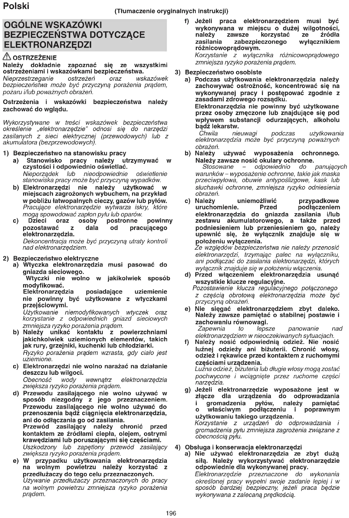 ELEKTRONARZĘDZI OSTRZEŻENIE Należy dokładnie zapoznać się ze wszystkimi ostrzeżeniami i wskazówkami bezpieczeństwa. Nieprzestrzeganie ostrzeżeń oraz wskazówek bezpieczeństwa może być przyczyną porażenia prądem, pożaru i/lub poważnych obrażeń. Ostrzeżenia i wskazówki bezpieczeństwa należy zachować do wglądu. Wykorzystywane w treści wskazówek bezpieczeństwa określenie „elektronarzędzie” odnosi się do narzędzi zasilanych z sieci elektrycznej (przewodowych) lub z akumulatora (bezprzewodowych).