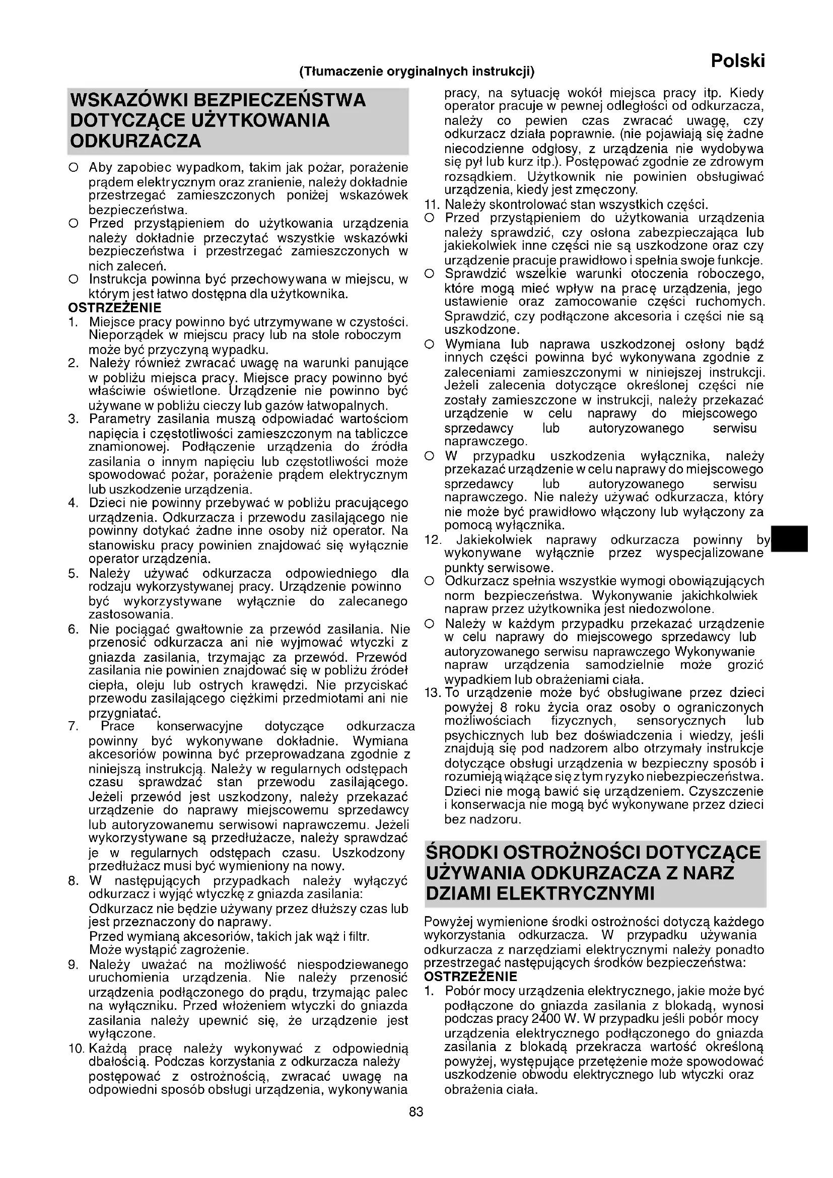 DZIAMI ELEKTRYCZNYMI Powyżej wymienione środki ostrożności dotyczą każdego wykorzystania odkurzacza. W przypadku używania odkurzacza z narzędziami elektrycznymi należy ponadto przestrzegać następujących środków bezpieczeństwa: OSTRZEŻENIE