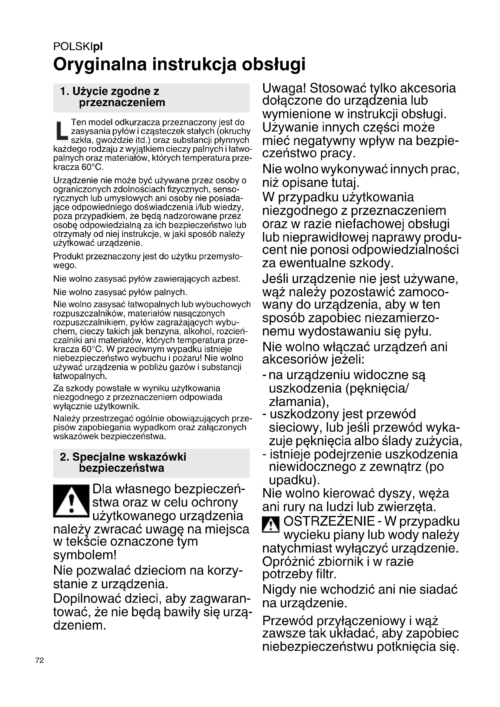 Oryginalna instrukcja obsługi Ten model odkurzacza przeznaczony jest do zasysania pyłów i cząsteczek stałych (okruchy szkła, gwoździe itd.) oraz substancji płynnych każdego rodzaju z wyjątkiem cieczy palnych i łatwo- palnych oraz materiałów, których temperatura prze- kracza 60°C. Urządzenie nie może być używane przez osoby o ograniczonych zdolnościach fizycznych, senso- rycznych lub umysłowych ani osoby nie posiada- jące odpowiedniego doświadczenia i/lub wiedzy, poza przypadkiem, że będą nadzorowane przez osobę odpowiedzialną za ich bezpieczeństwo lub otrzymały od niej instrukcje, w jaki sposób należy użytkować urządzenie. Produkt przeznaczony jest do użytku przemysło- wego. Nie wolno zasysać pyłów zawierających azbest. Nie wolno zasysać pyłów palnych. Nie wolno zasysać łatwopalnych lub wybuchowych rozpuszczalników, materiałów nasączonych rozpuszczalnikiem, py łów zagrażających wybu- chem, cieczy takich jak benzyna, alkohol, rozcień- czalniki ani materiałów, których temperatura prze- kracza 60°C. W przeciwnym wypadku istnieje niebezpieczeństwo wybuchu i pożaru! Nie wolno używać urządzenia w pobliżu gazów i substancji łatwopalnych. Za szkody powstałe w wyniku użytkowania niezgodnego z przeznaczeniem odpowiada wyłącznie użytkownik. Należy przestrzegać ogólnie obowiązujących prze- pisów zapobiegania wypadkom oraz załączonych wskazówek bezpieczeństwa. Dla własnego bezpieczeń- stwa oraz w celu ochrony użytkowanego urządzenia należy zwracać uwagę na miejsca w tekście oznaczone tym symbolem! Nie pozwalać dzieciom na korzy- stanie z urządzenia. Dopilnować dzieci, aby zagwaran- tować, że nie będą bawiły się urzą- dzeniem. Uwaga! Stosować tylko akcesoria dołączone do urządzenia lub wymienione w instrukcji obsługi. Używanie innych części może mieć negatywny wpływ na bezpie- czeństwo pracy. Nie wolno wykonywać innych prac, niż opisane tutaj. W przypadku użytkowania niezgodnego z przeznaczeniem oraz w razie niefachowej obsługi lub nieprawidłowej naprawy produ- cent nie ponosi odpowiedzialności za ewentualne szkody. Jeśli urządzenie nie jest używane, wąż należy pozostawić zamoco- wany do urządzenia, aby w ten sposób zapobiec niezamierzo- nemu wydostawaniu się pyłu. Nie wolno włączać urządzeń ani akcesoriów jeżeli: - na urządzeniu widoczne są uszkodzenia (pęknięcia/ złamania), - uszkodzony jest przewód sieciowy, lub jeśli przewód wyka- zuje pęknięcia albo ślady zużycia, - istnieje podejrzenie uszkodzenia niewidocznego z zewnątrz (po upadku). Nie wolno kierować dyszy, węża ani rury na ludzi lub zwierzęta. OSTRZEŻENIE - W przypadku wycieku piany lub wody należy natychmiast wyłączyć urządzenie. Opróżnić zbiornik i w razie potrzeby filtr. Nigdy nie wchodzić ani nie siadać na urządzenie. Przewód przyłączeniowy i wąż zawsze tak układać, aby zapobiec niebezpieczeństwu potknięcia się.