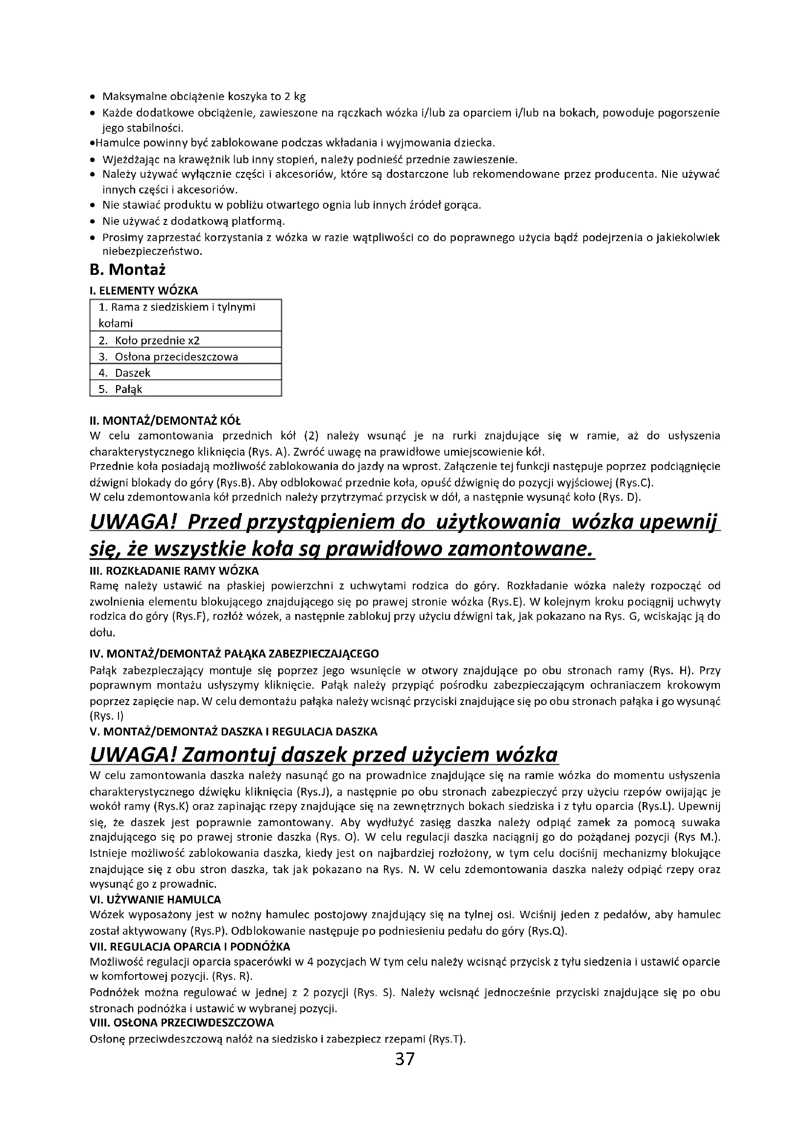 - Prosimy zaprzestać korzystania z wózka w razie wątpliwości co do poprawnego użycia bądź podejrzenia o jakiekolwiek niebezpieczeństwo. B. Montaż