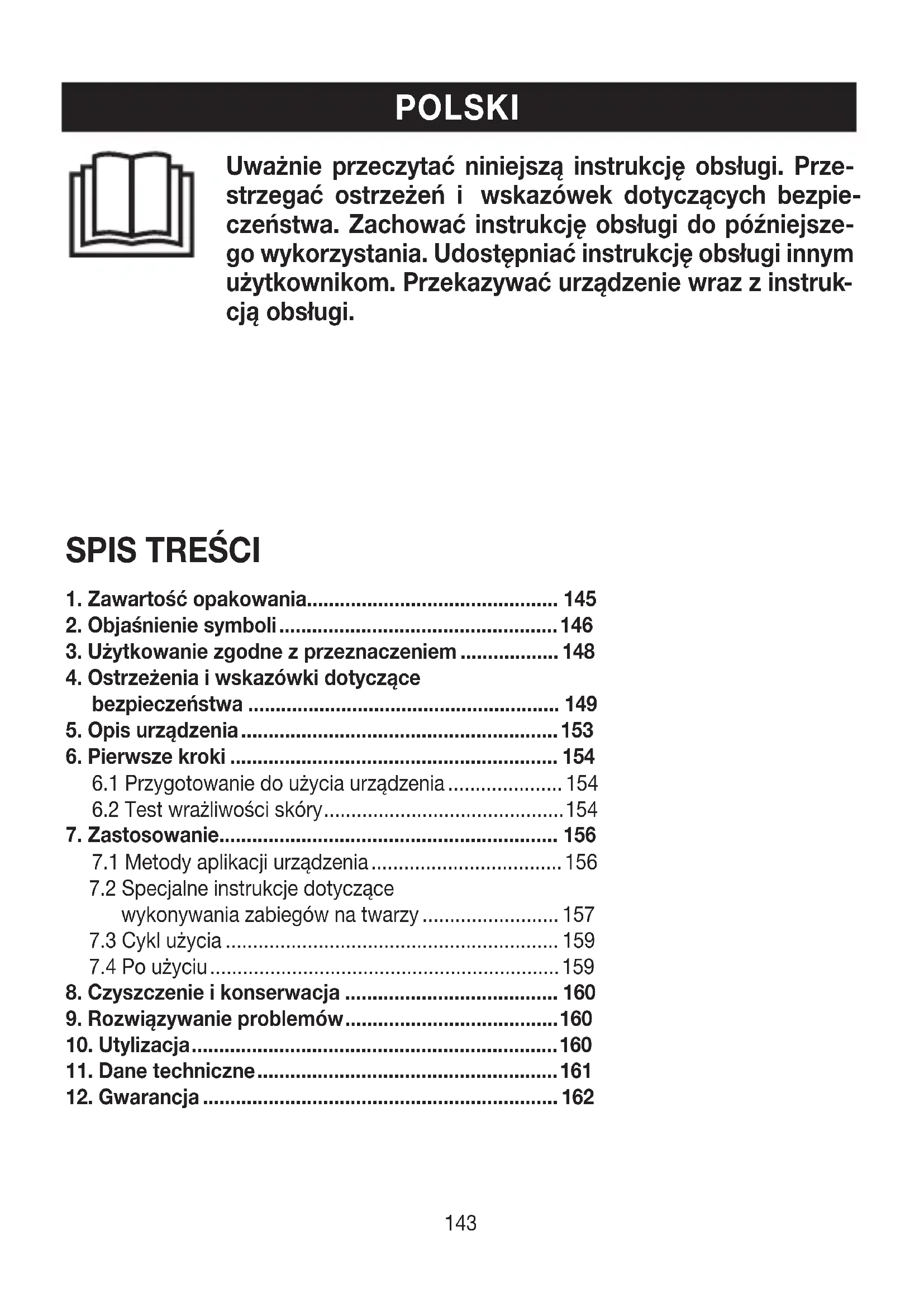 Urządzenia nie należy używać zżelem kontaktowym, gdyż mogłoby to prowadzić do uszkodzeń. Urządzenie działa najlepiej na włoski ociemniejszym zabarwieniu izawierające więcej melaniny. Czarne iciemnobrązowe włoski reagują najlepiej, natomiast brązowe ijasnobrązowe również będą reagować, ale zwykle wymagają więk- szej ilości zabiegów. Rude włosy mogą wykazać reakcje. Włosy białe, siwe lub blond zwykle nie reagują na urządzenie, chociaż uniektórych użytkowników stwierdzono rezultaty po wielokrotnych zabiegach.150 OSTRZEŻENIE Zabronione jest używanie urządzenia przez osoby, uktórych stwierdzono następu- jące choroby: