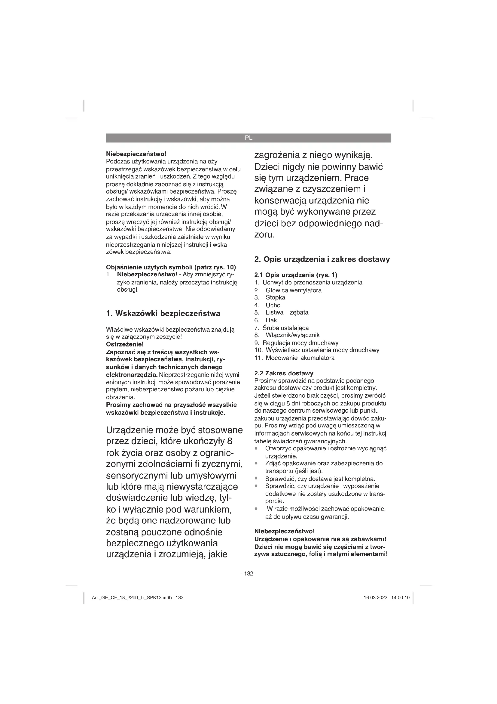 W razie możliwości zachować opakowanie, aż do upływu czasu gwarancji. Niebezpieczeństwo! Urządzenie i opakowanie nie są zabawkami! Dzieci nie mogą bawić się częściami z twor- zywa sztucznego, folią i małymi elementami! Anl_GE_CF_18_2200_Li_SPK13.indb 132Anl_GE_CF_18_2200_Li_SPK13.indb 132 16.03.2022 14:00:1016.03.2022 14:00:10PL