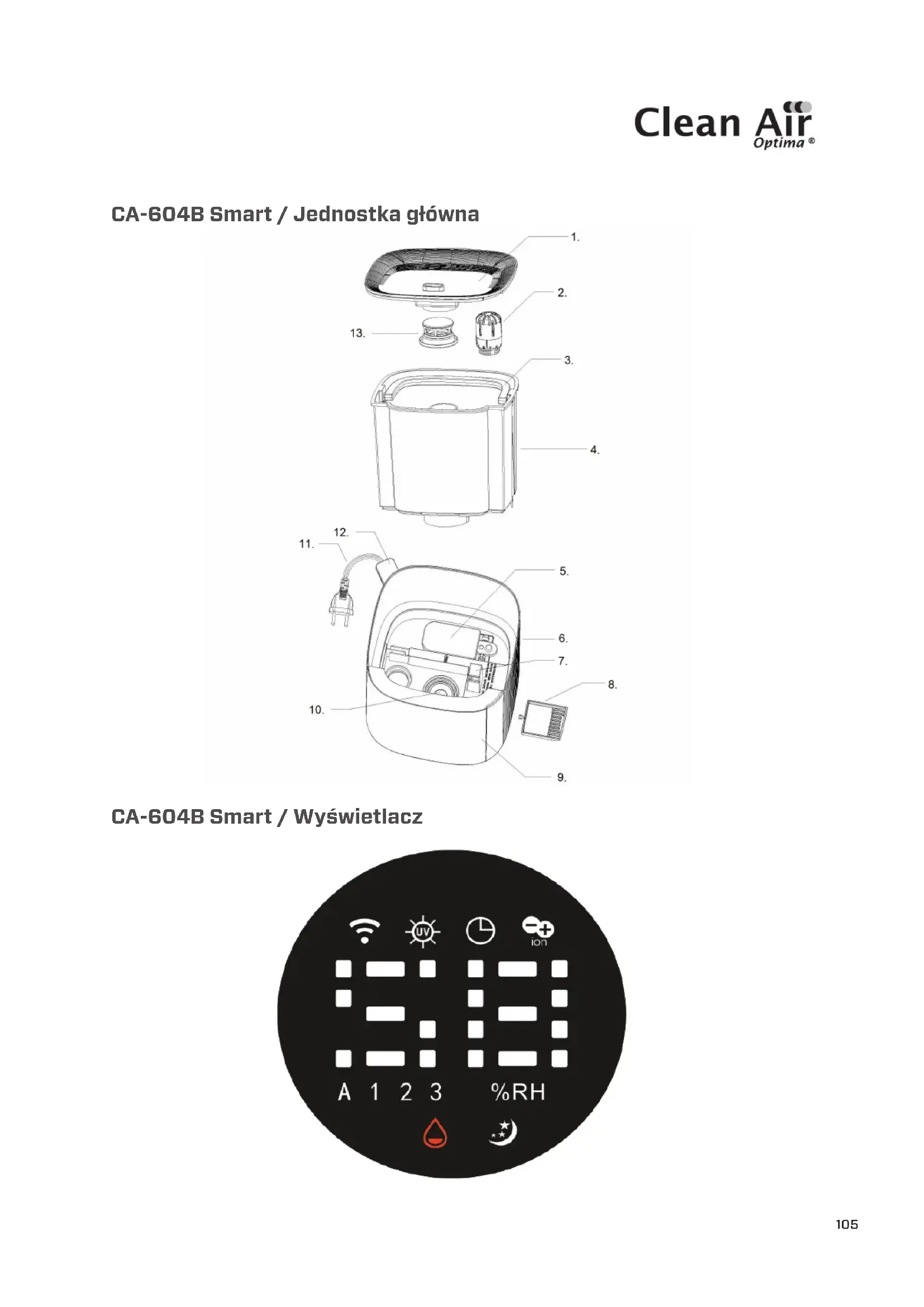 CA-604B Smart / Wyświetlacz106 Polski Dziękujemy za zakup nawilżacza ultradźwiękowego Clean Air Optima® CA-604B Smart. Życzymy wieloletniego korzystania z tego wydajnego i skutecznego produktu, który zapewnia zdrowe powietrze w pomieszczeniach. W niniejszej instrukcji obsługi opisano zasady bezpieczeństwa, których należy przestrzegać podczas użytkowania. Mają one na celu zapobieganie urazom i uniknięcie uszkodzenia urządzenia. Opis urządzenia Urządzenie składa się z następujących elementów podstawowych: