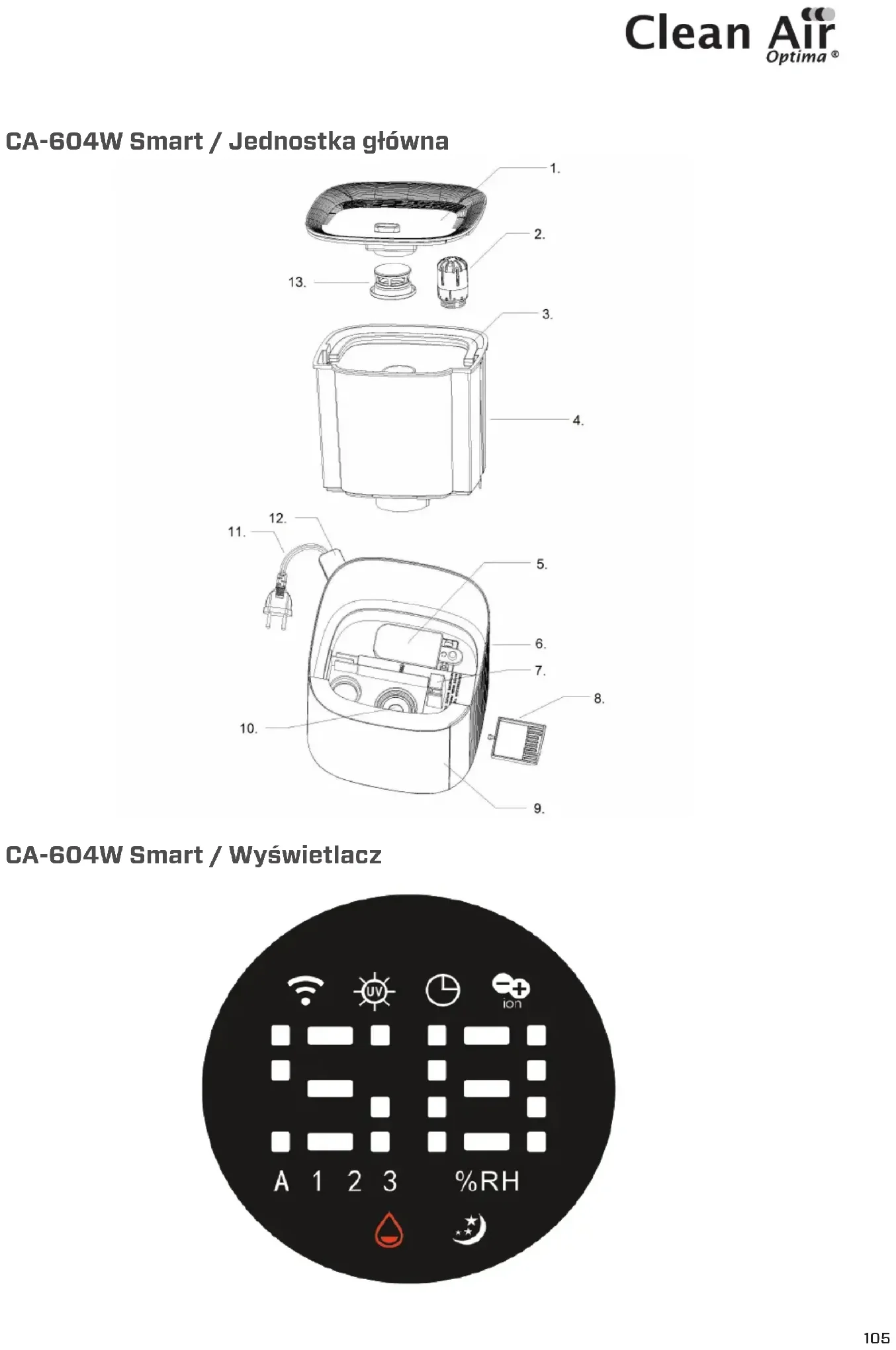 CA-604W Smart / Wyświetlacz106 Polski Dziękujemy za zakup nawilżacza ultradźwiękowego Clean Air Optima® CA-604W Smart. Życzymy wieloletniego korzystania z tego wydajnego i skutecznego produktu, który zapewnia zdrowe powietrze w pomieszczeniach. W niniejszej instrukcji obsługi opisano zasady bezpieczeństwa, których należy przestrzegać podczas użytkowania. Mają one na celu zapobieganie urazom i uniknięcie uszkodzenia urządzenia. Opis urządzenia Urządzenie składa się z następujących elementów podstawowych:
