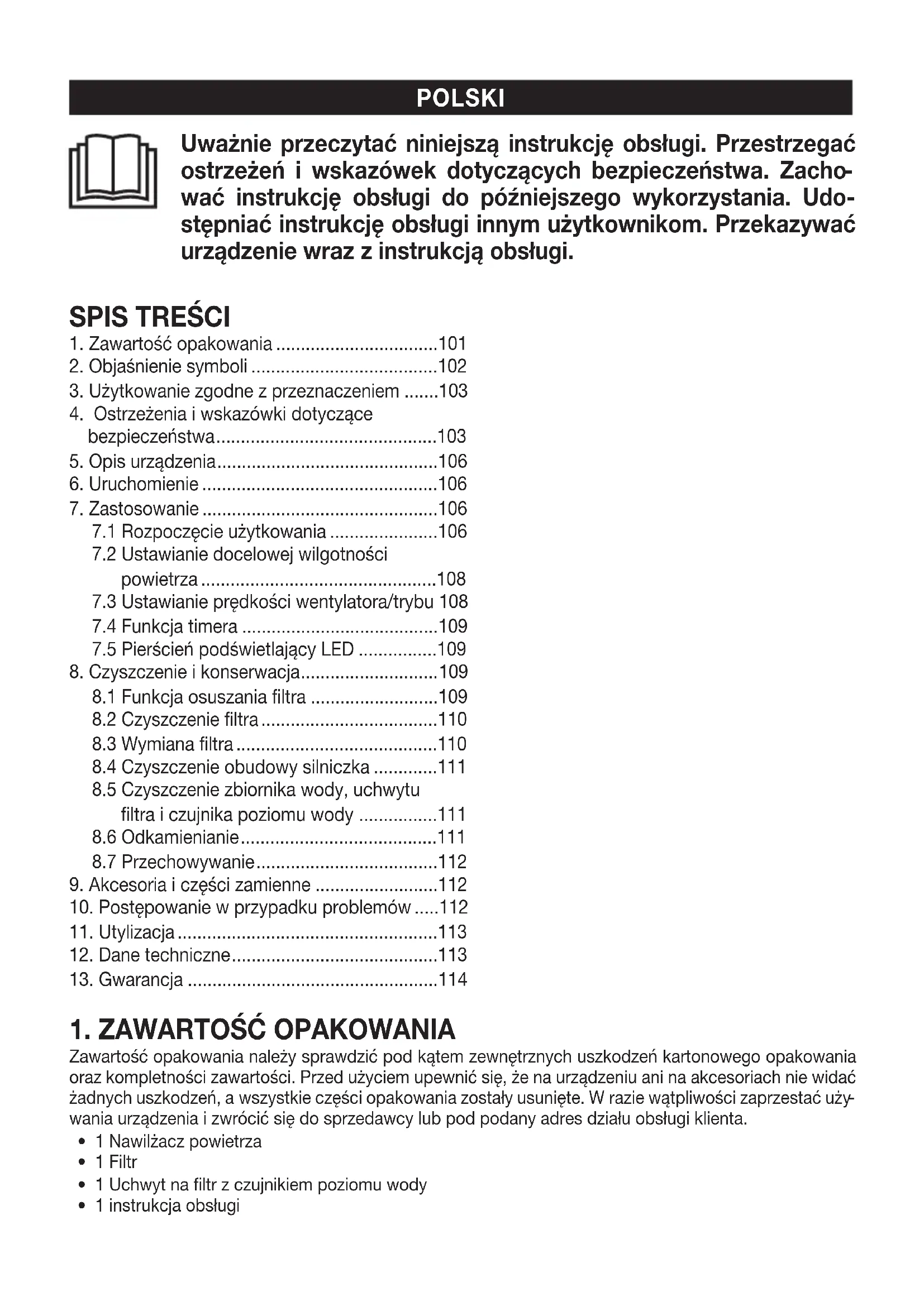 Более подробная информация огарантии игарантийных условиях находится вгарантийном талоне, который входит вкомплект поставки.100 101 Uważnie przeczytać niniejszą instrukcję obsługi. Przestrzegać ostrzeżeń i wskazówek dotyczących bezpieczeństwa. Zacho