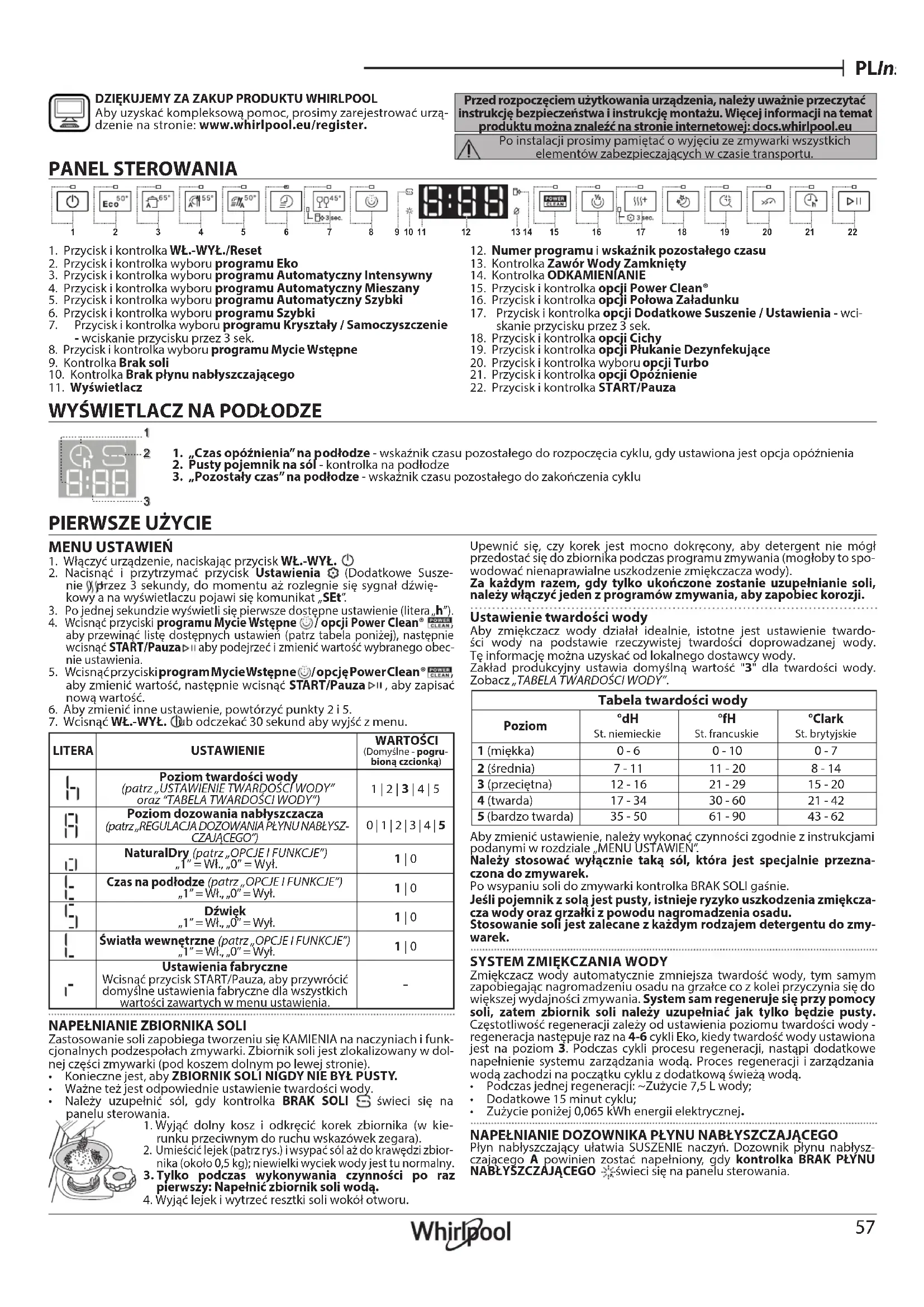 Aby uzyskać kompleksową pomoc, prosimy zarejestrować urzą- dzenie na stronie: www.whirlpool.eu/register. Przed rozpoczęciem użytkowania urządzenia, należy uważnie przeczytać instrukcję bezpieczeństwa iinstrukcję montażu. Więcej informacji na temat produktu można znaleźć na stronie internetowej: docs.whirlpool.eu Po instalacji prosimy pamiętać owyjęciu ze zmywarki wszystkich elementów zabezpieczających wczasie transportu. MENU USTAWIEŃ