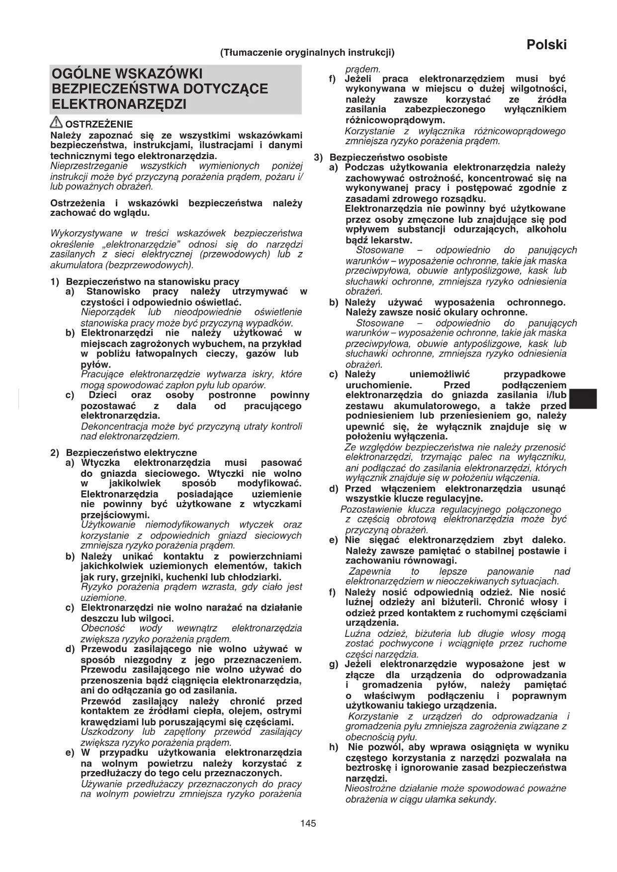 a) Stanowisko pracy należy utrzymywać w czystości i odpowiednio oświetlać. Nieporządek lub nieodpowiednie oświetlenie stanowiska pracy może być przyczyną wypadków. b) Elektronarzędzi nie należy użytkować