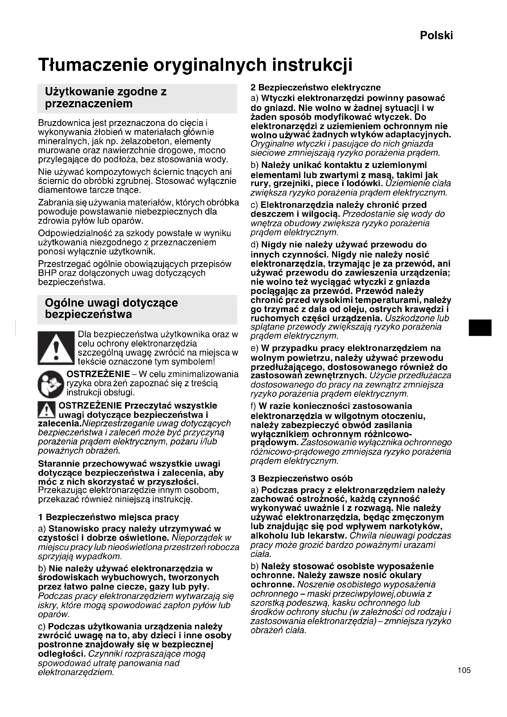 Εξαιτίας του συνεχιζόμενου προγράμματος έρευνας και ανάπτυξης της HiKOKI, τα τεχνικά χαρακτηριστικά που αναφέρονται εδώ μπορούν να αλλάξουν χωρίς προηγούμενη ειδοποίηση. 000book_CM5MA.book 104 ページ 2022年7月20日 水曜日 午後4時50分105 Polski Tłumaczenie oryginalnych instrukcji Bruzdownica jest przeznaczona do cięcia i wykonywania żłobień w materiałach głównie mineralnych, jak np. żelazobeton, elementy murowane oraz nawierzchnie drogowe, mocno przylegające do podłoża, bez stosowania wody. Nie używać kompozytowych ściernic tnących ani ściernic do obróbki zgrubnej. Stosować wyłącznie diamentowe tarcze tnące. Zabrania się używania materiałów, których obróbka powoduje powstawanie niebezpiecznych dla zdrowia pyłów lub oparów. Odpowiedzialność za szkody powstałe w wyniku użytkowania niezgodnego z przeznaczeniem ponosi wyłącznie użytkownik. Przestrzegać ogólnie obowiązujących przepisów BHP oraz dołączonych uwag dotyczących bezpieczeństwa. Dla bezpieczeństwa użytkownika oraz w celu ochrony elektronarzędzia szczególną uwagę zwrócić na miejsca w tekście oznaczone tym symbolem! OSTRZEŻENIE – W celu zminimalizowania ryzyka obra żeń zapoznać się z treścią instrukcji obsługi. OSTRZEŻENIE Przeczytać wszystkie uwagi dotyczące bezpieczeństwa i zalecenia.Nieprzestrzeganie uwag dotyczących bezpieczeństwa i zaleceń może być przyczyną porażenia prądem elektrycznym, pożaru i/lub poważnych obrażeń. Starannie przechowywać wszystkie uwagi dotyczące bezpieczeństwa i zalecenia, aby móc z nich skorzystać w przyszłości. Przekazując elektronarzędzie innym osobom, przekazać również niniejszą instrukcję. 1 Bezpieczeństwo miejsca pracy a) Stanowisko pracy należy utrzymywać w czystości i dobrze oświetlone. Nieporządek w miejscu pracy lub nieoświetlona przestrzeń robocza sprzyjają wypadkom. b) Nie należy używać elektronarzędzia w środowiskach wybuchowych, tworzonych przez łatwo palne ciecze, gazy lub pyły. Podczas pracy elektronarzędziem wytwarzają się iskry, które mogą spowodować zapłon pyłów lub oparów. c) Podczas użytkowania urządzenia należy zwrócić uwagę na to, aby dzieci i inne osoby postronne znajdowały się w bezpiecznej odległości. Czynniki rozpraszające mogą spowodować utratę panowania nad elektronarzędziem. 2 Bezpieczeństwo elektryczne a) Wtyczki elektronarzędzi powinny pasować do gniazd. Nie wolno w żadnej sytuacji i w żaden sposób modyfikować wtyczek. Do elektronarzędzi z uziemieniem ochronnym nie wolno uż ywać żadnych wtyków adaptacyjnych. Oryginalne wtyczki i pasujące do nich gniazda sieciowe zmniejszają ryzyko porażenia prądem. b) Należy unikać kontaktu z uziemionymi elementami lub zwartymi z masą, takimi jak rury, grzejniki, piece i lodówki. Uziemienie ciała zwiększa ryzyko porażenia prądem elektrycznym. c) Elektronarzędzia należy chronić przed deszczem i wilgocią. Przedostanie się wody do wnętrza obudowy zwiększa ryzyko porażenia prądem elektrycznym. d) Nigdy nie należy używać przewodu do innych czynności. Nigdy nie należy nosić elektronarzędzia, trzymając je za przewód, ani używać przewodu do zawieszenia urządzenia; nie wolno też wyciągać wtyczki z gniazda pociągając za przewód. Przewód nale