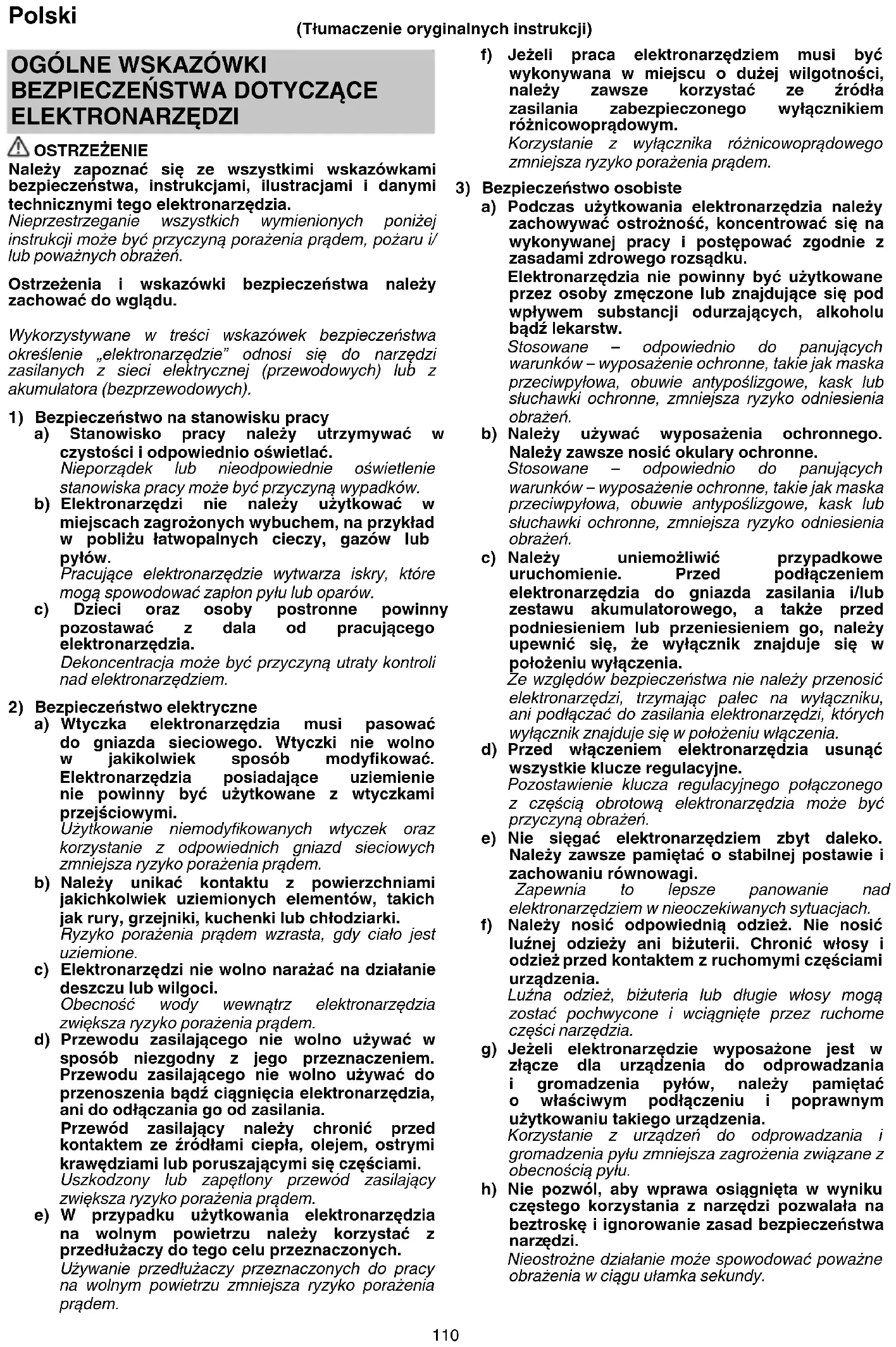 ELEKTRONARZĘDZI OSTRZEŻENIE Należy zapoznać się ze wszystkimi wskazówkami bezpieczeństwa, instrukcjami, ilustracjami i danymi technicznymi tego elektronarzędzia. Nieprzestrzeganie wszystkich wymienionych poniżej instrukcji może być przyczyną porażenia prądem, pożaru i/ lub poważnych obrażeń. Ostrzeżenia i wskazówki bezpieczeństwa należy zachować do wglądu. Wykorzystywane w treści wskazówek bezpieczeństwa określenie „elektronarzędzie” odnosi się do narzędzi zasilanych z sieci elektrycznej (przewodowych) lub z akumulatora (bezprzewodowych).