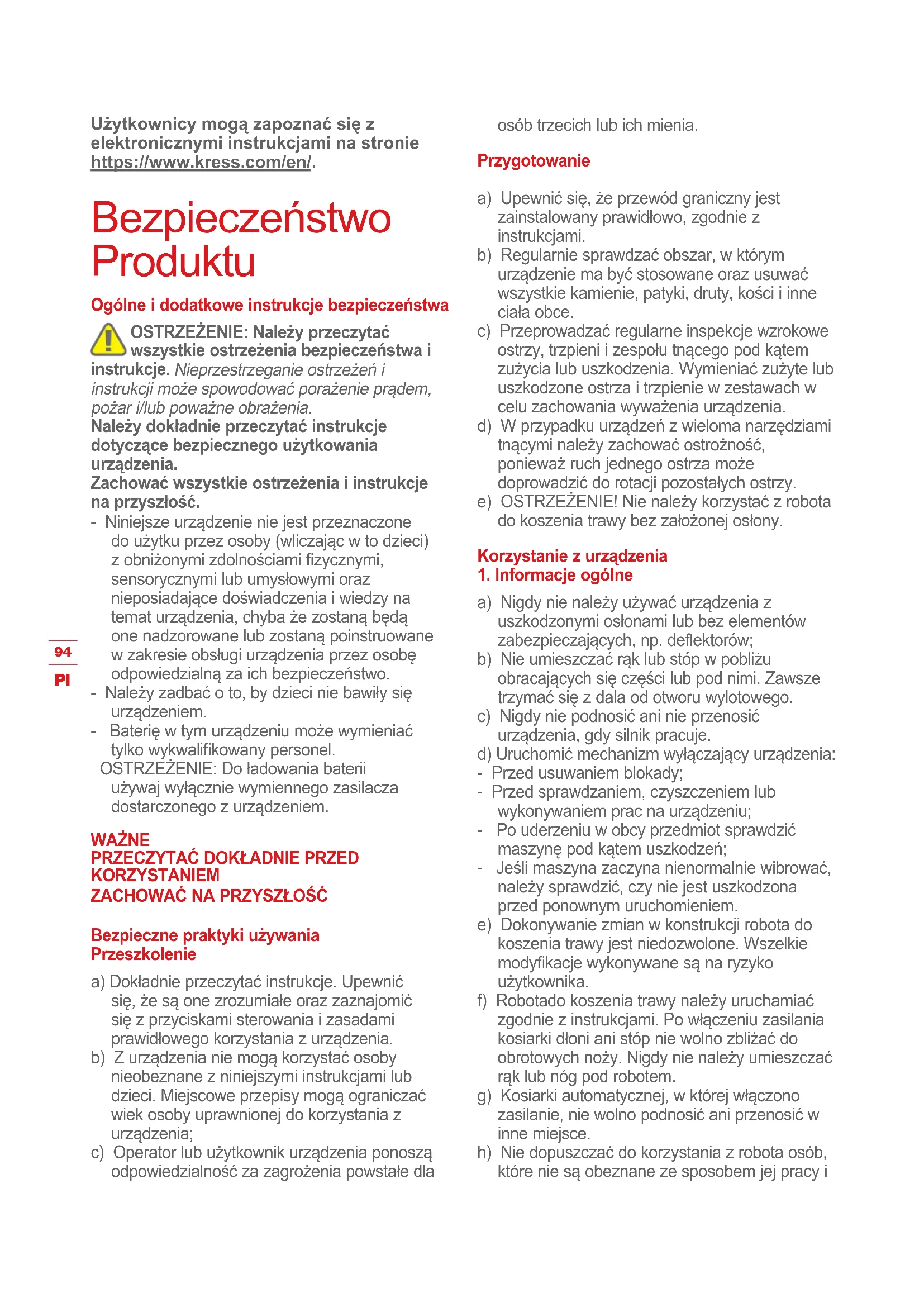 Użytkownicy mogą zapoznać się z elektronicznymi instrukcjami na stronie https://www.kress.com/en/. Bezpieczeństwo Produktu Ogólne i dodatkowe instrukcje bezpieczeństwa OSTRZEŻENIE: Należy przeczytać wszystkie ostrzeżenia bezpieczeństwa i instrukcje. Nieprzestrzeganie ostrzeżeń i instrukcji może spowodować porażenie prądem, pożar i/lub poważne obrażenia. Należy dokładnie przeczytać instrukcje dotyczące bezpiecznego użytkowania urządzenia. Zachować wszystkie ostrzeżenia i instrukcje na przyszłość. - Niniejsze urządzenie nie jest przeznaczone do użytku przez osoby (wliczając w to dzieci) z obniżonymi zdolnościami zycznymi, sensorycznymi lub umysłowymi oraz nieposiadające doświadczenia i wiedzy na temat urządzenia, chyba że zostaną będą one nadzorowane lub zostaną poinstruowane w zakresie obsługi urządzenia przez osobę odpowiedzialną za ich bezpieczeństwo. - Należy zadbać o to, by dzieci nie bawiły się urządzeniem. - Baterię w tym urządzeniu może wymieniać tylko wykwalikowany personel. OSTRZEŻENIE: Do ładowania baterii używaj wyłącznie wymiennego zasilacza dostarczonego z urządzeniem. WAŻNE
