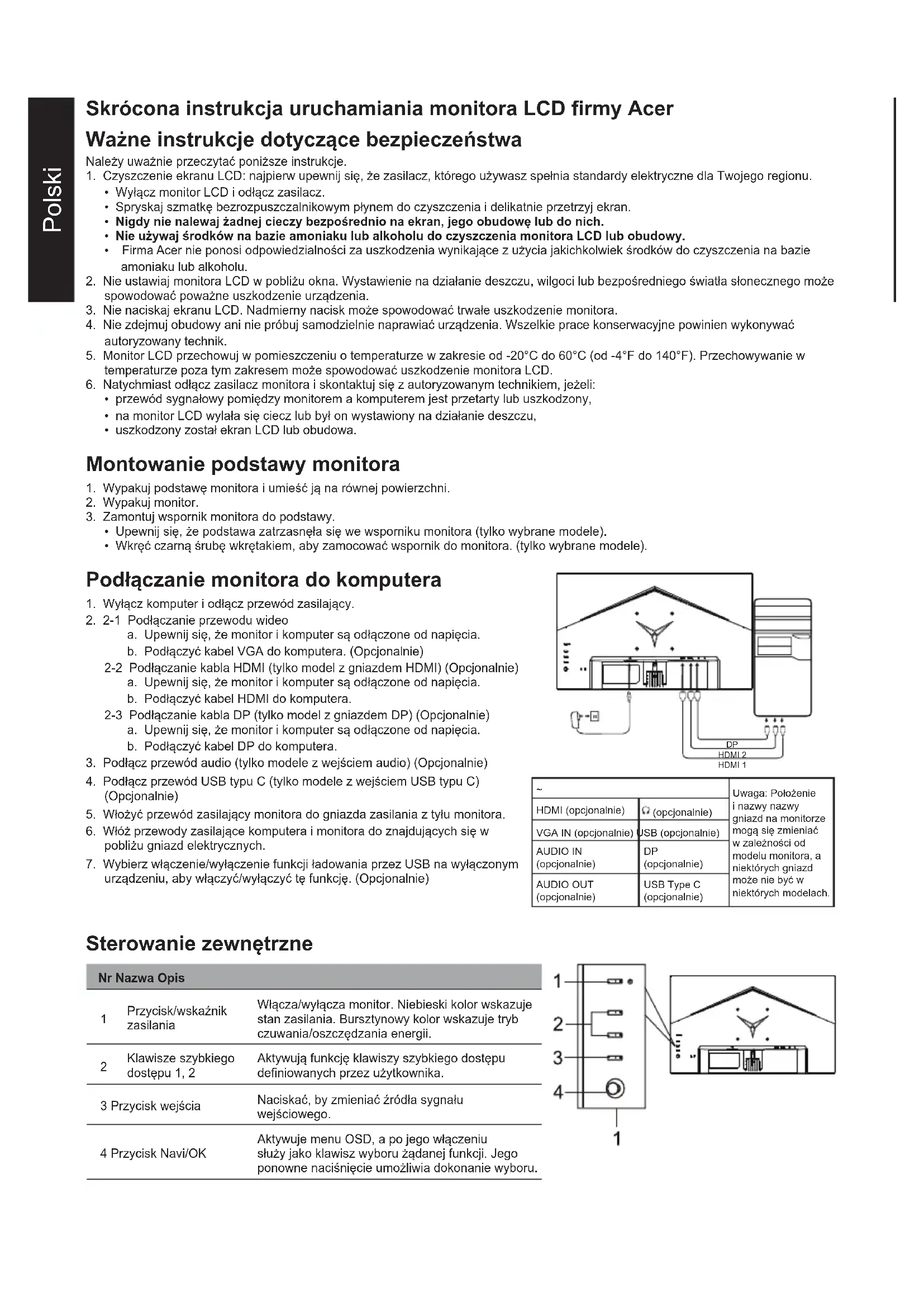 (typowy) Kontrast Maks. 100000000:1 (ACM) Kąt widzenia 178° (w poziomie) 178° (w pionie) (CR=10) Czas reakcji 2 (szary do szarego), 0,5 ms (szary do szarego, min.) Typ panela VA Częstotliwość pozioma HDMI: 31,469 - 192,692 KHz DP: 31,469 - 192,692 KHz Częstotliwość pionowa HDMI: 48 - 165 Hz DP: 48 - 165 Hz Wyświetlane kolory 16,7 mln kolorów Zegar plamki HDMI: 393,092 MHz DP: 393,092 MHz Maksymalna rozdzielczość HDMI: 1920 x 1080 przy częstotliwości 165 Hz DP: 1920 x 1080 przy częstotliwości 165 Hz Plug & Play VESA DDCCI/DDC2B Pobór mocy Tryb włączenia 25 W (typowy) Tryb uśpienia 0,5 W (typowy) Tryb wyłączenia 0,3 W (typowy) Złącze wejściowe HDMI (tylko modele z wejściem HDMI) (opcjonalnie) DP (tylko model z wejściem DP) (opcjonalnie) Sygnał wejścia video DP (tylko model z wejściem DP) (opcjonalnie) HDMI (tylko modele z wejściem HDMI) (opcjonalnie) Głośniki 2W x 2 (tylko modele z wejściem audio) (opcjonalnie) Maksymalny rozmiar ekranu W poziomie: 598 mm W pionie: 336 mm Źródło zasilania WEJŚCIE: 100-240 V ~ 50/60 Hz Warunki otoczenia Temp. działania: Od 0° do 40°C Temp. przechowywania: Od -20° do 60°C Wilgotność podczas pracy: Od 20% do 80% Wymiary 614,7 (szer.) × 456,1 (wys.) × 240,7 (głęb.) mm Masa (netto) 3,80 kg (netto) Dane techniczne mechanizmu Nachylanie: -5° do +15° Obracanie: Nie Regulacja wysokości: Nie Przekręcanie: Nie Odłączane nóżki podstawy: Tak Zewnętrzne elementy sterowania Przełącznik/przyciski Przycisk Zasilanie Klawisz szybkiego dostępu 1 Klawisz szybkiego dostępu 2 Wejście Menu/Navi/OK Funkcje Jasność Kontrast Niska Emisja Niebieskiego Światła Wzmocn. czerni ACM HDR Super ostrość Gamma Temp. koloru Tryby Przestrz. kolor. Tryb odc. szar. 6-osiowa barwa Nasyc. 6-osiow Głośność Wyciszenie Over Drive FreeSync Premium VRB Częst. odśwież. Bardzo małe opóźnienie Cel Język Wyłączenie OSD Przezroczystość Blokada OSD Wejście Auto źródło Tryb szeroki Przypis. przyc. skrótu DDC/CI Poz. czarn. HDMI Tryb szyb. uruch Informacje Resetuj wszyst. ustaw. Dane techniczne zależą od modelu i/lub regionu. Podręczniki i inne dokumenty dla produktu Acer, można znaleźć na oficjalnej stronie internetowej pomocy technicznej Acer.Português Manual de início rápido (QSG) do monitor LCD da Acer Instruções de segurança importantes Leia atentamente as instruções que se seguem. 1. Limpar o ecrã do monitor LCD: primeiro, verificar se o adaptador de corrente que está a usar corresponde às normas elétricas da sua região.