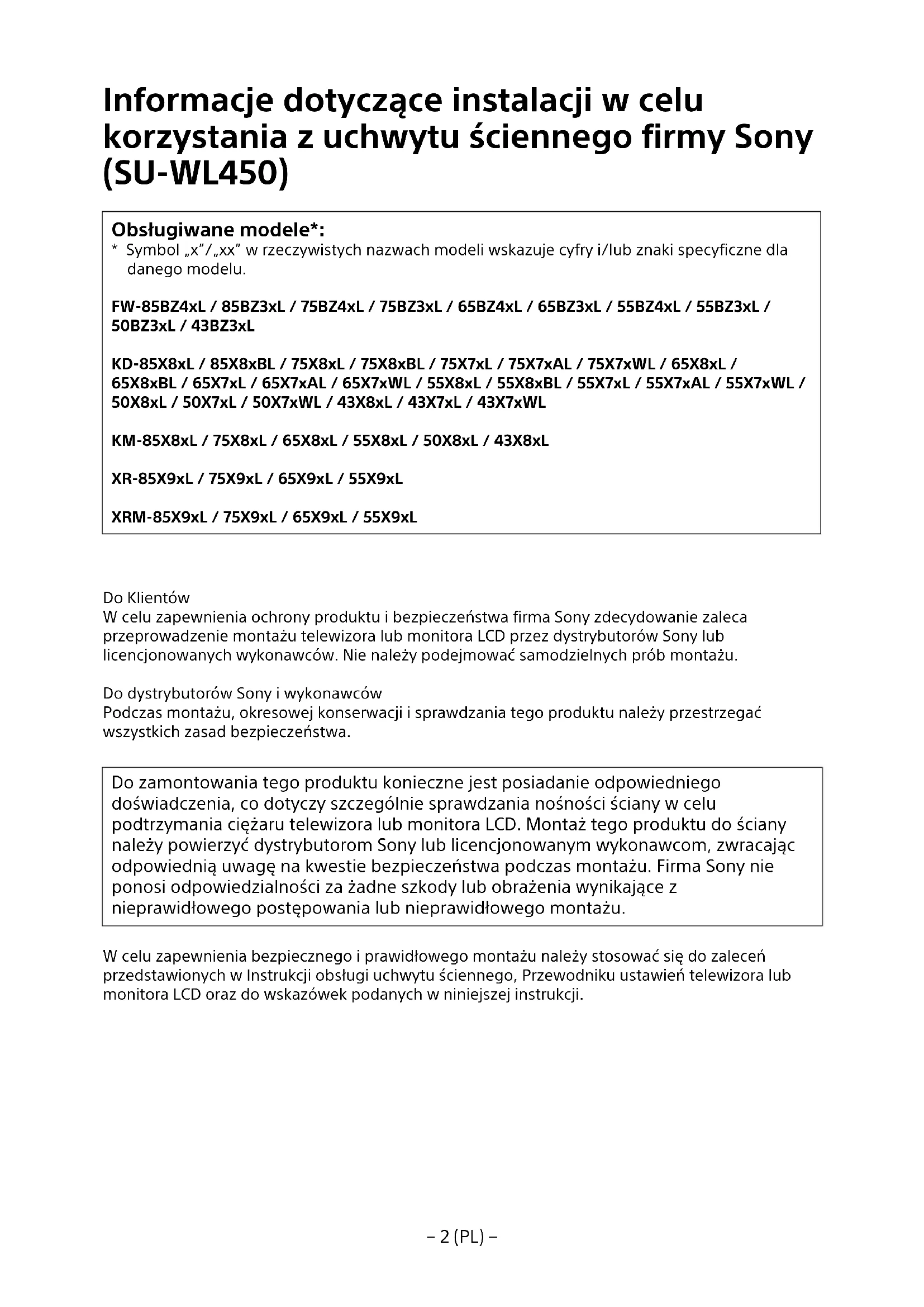 - Symbol „x”/„xx” w rzeczywistych nazwach modeli wskazuje cyfry i/lub znaki specyficzne dla danego modelu. FW-85BZ4xL / 85BZ3xL / 75BZ4xL / 75BZ3xL / 65BZ4xL / 65BZ3xL / 55BZ4xL / 55BZ3xL / 50BZ3xL / 43BZ3xL KD-85X8xL / 85X8xBL / 75X8xL / 75X8xBL / 75X7xL / 75X7xAL / 75X7xWL / 65X8xL / 65X8xBL/ 65X7xL / 65X7xAL / 65X7xWL / 55X8xL / 55X8xBL / 55X7xL / 55X7xAL / 55X7xWL / 50X8xL / 50X7xL / 50X7xWL / 43X8xL / 43X7xL / 43X7xWL KM-85X8xL / 75X8xL / 65X8xL / 55X8xL / 50X8xL / 43X8xL XR-85X9xL / 75X9xL / 65X9xL / 55X9xL XRM-85X9xL / 75X9xL / 65X9xL / 55X9xL Do Klientów W celu zapewnienia ochrony produktu i bezpieczeństwa firma Sony zdecydowanie zaleca przeprowadzenie montażu telewizora lub monitora LCD przez dystrybutorów Sony lub licencjonowanych wykonawców. Nie należy podejmować samodzielnych prób montażu. Do dystrybutorów Sony i wykonawców Podczas montażu, okresowej konserwacji i sprawdzania tego produktu należy przestrzegać wszystkich zasad bezpieczeństwa. Do zamontowania tego produktu konieczne jest posiadanie odpowiedniego doświadczenia, co dotyczy szczególnie sprawdzania nośności ściany w celu podtrzymania ciężaru telewizora lub monitora LCD. Montaż tego produktu do ściany należy powierzyć dystrybutorom Sony lub licencjonowanym wykonawcom, zwracając odpowiednią uwagę na kwestie bezpieczeństwa podczas montażu. Firma Sony nie ponosi odpowiedzialności za żadne szkody lub obrażenia wynikające z nieprawidłowego postępowania lub nieprawidłowego montażu. W celu zapewnienia bezpiecznego i prawidłowego montażu należy stosować się do zaleceń przedstawionych w Instrukcji obsługi uchwytu ściennego, Przewodniku ustawień telewizora lub monitora LCD oraz do wskazówek podanych w niniejszej instrukcji.− 3 (PL) −