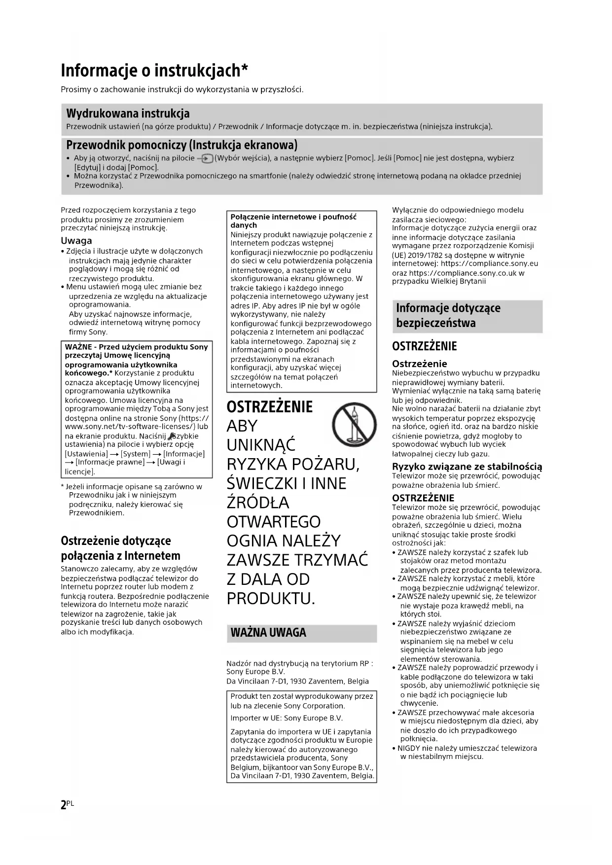 PRODUKTU. Nadzór nad dystrybucją na terytorium RP :Sony Europe B.V.Da Vincilaan 7-D1, 1930 Zaventem, BelgiaWyłącznie do odpowiedniego modelu zasilacza sieciowego:Informacje dotyczące zużycia energii oraz inne informacje dotyczące zasilania wymagane przez rozporządzenie Komisji (UE) 2019/1782 są dostępne w witrynie internetowej: https://compliance.sony.eu oraz https://compliance.sony.co.uk w przypadku Wielkiej Brytanii OSTRZEŻENIE Ostrzeżenie Niebezpieczeństwo wybuchu w przypadku nieprawidłowej wymiany baterii. Wymieniać wyłącznie na taką samą baterię lub jej odpowiednik.Nie wolno narażać baterii na działanie zbyt wysokich temperatur poprzez ekspozycję na słońce, ogień itd. oraz na bardzo niskie ciśnienie powietrza, gdyż mogłoby to spowodować wybuch lub wyciek łatwopalnej cieczy lub gazu. Ryzyko związane ze stabilnością Telewizor może się przewrócić, powodując poważne obrażenia lub śmierć. OSTRZEŻENIE Telewizor może się przewrócić, powodując poważne obrażenia lub śmierć. Wielu obrażeń, szczególnie u dzieci, można uniknąć stosując takie proste środki ostrożności jak:• ZAWSZE należy korzystać z szafek lub stojaków oraz metod montażu zalecanych przez producenta telewizora.• ZAWSZE należy korzystać z mebli, które mogą bezpiecznie udźwignąć telewizor.• ZAWSZE należy upewnić się, że telewizor nie wystaje poza krawędź mebli, na których stoi.• ZAWSZE należy wyjaśnić dzieciom niebezpieczeństwo związane ze wspinaniem się na mebel w celu sięgnięcia telewizora lub jego elementów sterowania.• ZAWSZE należy poprowadzić przewody i kable podłączone do telewizora w taki sposób, aby uniemożliwić potknięcie się o nie bądź ich pociągnięcie lub chwycenie.• ZAWSZE przechowywać małe akcesoria w miejscu niedostępnym dla dzieci, aby nie doszło do ich przypadkowego połknięcia.• NIGDY nie należy umieszczać telewizora w niestabilnym miejscu. Informacje o instrukcjach* Prosimy o zachowanie instrukcji do wykorzystania w przyszłości. Wydrukowana instrukcja Przewodnik ustawień (na górze produktu) / Przewodnik / Informacje dotyczące m. in. bezpieczeństwa (niniejsza instrukcja). Przewodnik pomocniczy (Instrukcja ekranowa)