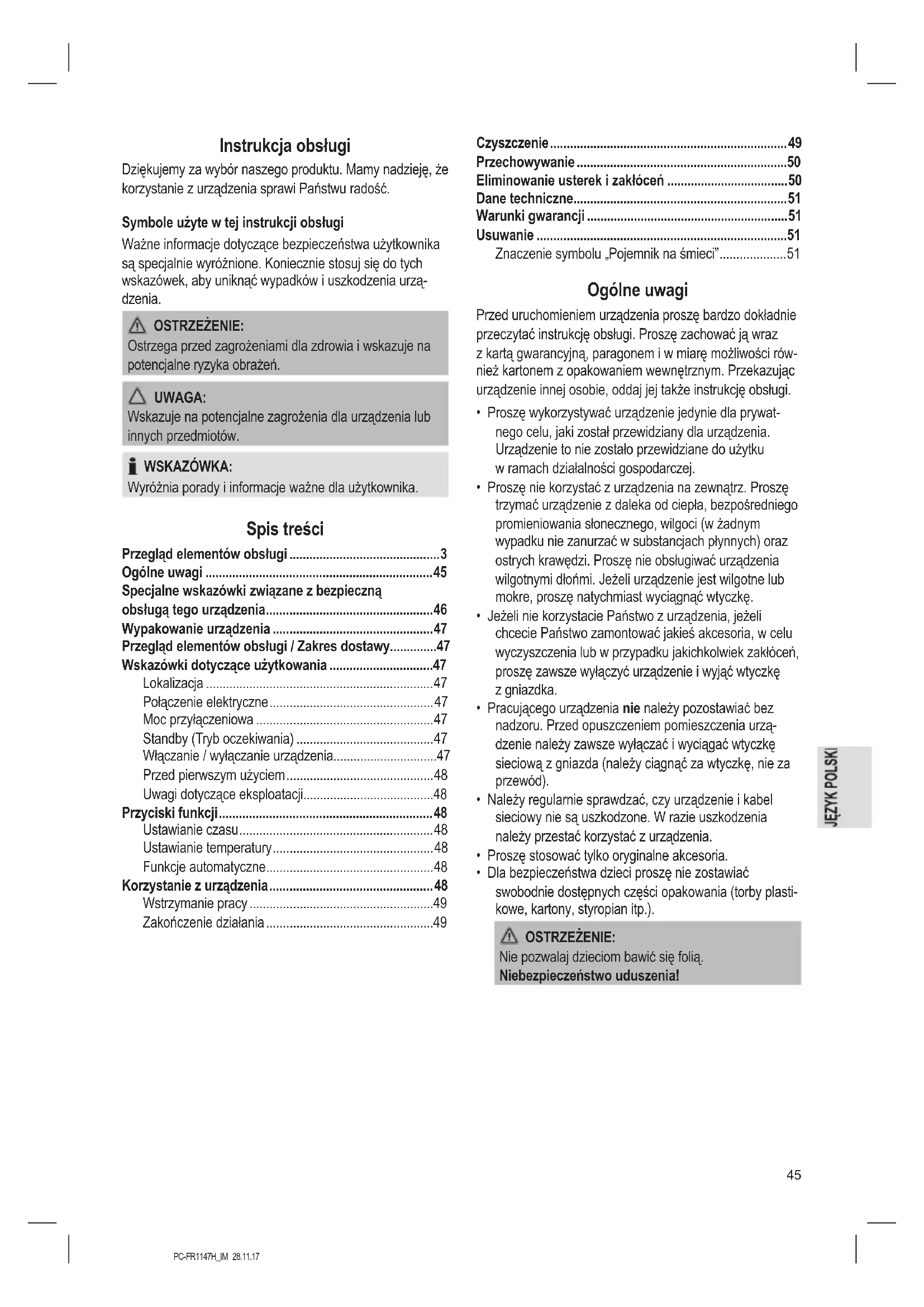 - Dla bezpieczeństwa dzieci proszę nie zostawiać swobodnie dostępnych części opakowania (torby plasti- kowe, kartony, styropian itp.). OSTRZEŻENIE: Nie pozwalaj dzieciom bawić się folią. Niebezpieczeństwo uduszenia!PC-FR1147H_IM 28.11.17