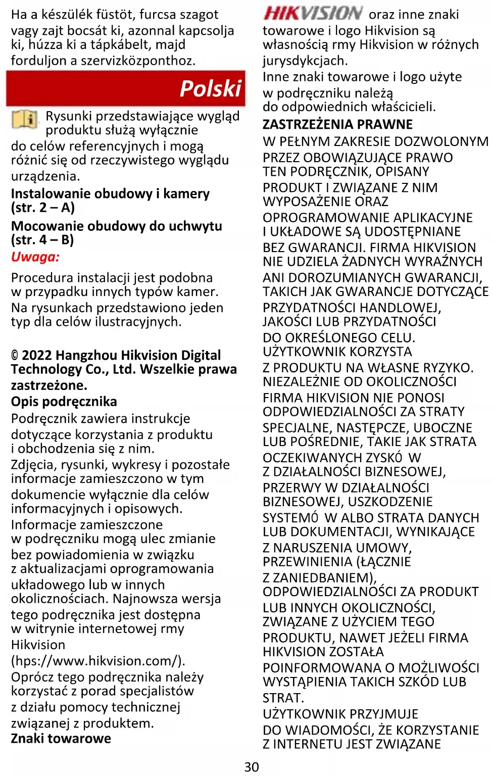 Zalecenia dotyczące bezpieczeństwa Ostrzeżenia Przepisy i rozporządzenia Urządzenie powinno być użytkowane zgodnie z lokalnymi przepisami, rozporządzeniami dotyczącymi korzystania z wyposażenia elektrycznego i przepisami przeciwpożarowymi. Bezpieczeństwo elektryczne PRZESTROGA: Aby ograniczyć zagrożenie pożarowe, należy używać bezpieczników tego samego typu i o takich samych parametrach znamionowych. Przestrogi Ochrona przeciwpożarowa Nie wolno umieszczać na urządzeniu źródeł nieosłoniętego płomienia, takich jak zapalone świece. Instalacja Urządzenie należy zainstalować zgodnie z instrukcjami podanymi w tym podręczniku. Aby zapobiec zranieniu, należy przymocować urządzenie do sufitu/ściany zgodnie z instrukcjami instalacyjnymi. Należy upewnić się, że dostępne jest32 miejsce wymagane do instalacji urządzenia i akcesoriów. Należy upewnić się, że ściana jest przystosowana do obciążenia co najmniej ośmiokrotnie większego niż ciężar urządzenia z uchwytem. Przed podłączeniem, instalacją lub demontażem urządzenia należy odłączyć zasilanie urządzenia. Transport Podczas transportu urządzenie powinno być umieszczone w oryginalnym lub podobnym opakowaniu. Należy chronić urządzenie przed upadkiem lub udarami mechanicznymi. Zasilanie Należy korzystać z zasilaczy dostarczonych przez wykwalifikowanych producentów. Zalecane jest użycie oddzielnego zasilacza dla każdego urządzenia, ponieważ przeciążenie zasilacza może spowodować przegrzanie lub pożar. Konserwacja Jeżeli produkt nie działa prawidłowo, skontaktuj się z dystrybutorem lub najbliższym centrum serwisowym. Producent nie ponosi odpowiedzialności za problemy spowodowane przez nieautoryzowane prace naprawcze lub konserwacyjne. Konieczna jest regularna wymiana kilku podzespołów urządzenia. Przeciętny okres użytkowania może być różny, dlatego zalecane jest regularne sprawdzanie stanu technicznego podzespołów. Aby uzyskać więcej informacji, należy skontaktować się z dystrybutorem. Czyszczenie Należy czyścić elementy wewnętrzne i zewnętrzne miękką, suchą ściereczką. Nie wolno stosować zasadowych środków czyszczących. Warunki otoczenia Jeżeli używane jest wyposażenie laserowe, należy upewnić się, że obiektyw urządzenia nie jest oświetlany przez wiązkę lasera, ponieważ może to spowodować jego spalenie. Nie wolno kierować otworu w obudowie w stronę słońca lub innego źródła intensywnego światła. Aby zapobiec akumulacji ciepła, należy zapewnić odpowiednią wentylację urządzenia. NIE wolno narażać urządzenia na ekstremalnie wysokie lub niskie temperatury, kurz, substancje korozyjne, roztwory soli, zasady lub wilgoć. Aby ustalić wymagania dotyczące temperatury i wilgotności, skorzystaj ze specyfikacji urządzenia. Należy chronić urządzenie przed silnym promieniowaniem elektromagnetycznym. Poważne awarie Jeżeli urządzenie wydziela dym lub intensywny zapach albo emituje hałas, należy niezwłocznie wyłączyć zasilanie i odłączyć przewód zasilający, a następnie skontaktować się z centrum serwisowym. Română Aspectul produsului este doar de referinţă şi poate varia de produsul real. Instalarea carcasei şi a camerei (Pagina 2 - A) Instalarea carcasei la suport (Pagina 4 - B) Notă: Paşii de instalare pentru diferite tipuri de camere sunt similare. Diagramele folosesc un singur tip pentru ilustrare.33 © 2022 Hangzhou Hikvision Digital Technology Co., Ltd. Toate drepturile rezervate. Despre acest Manual Manualul include instrucţiuni pentru utilizarea şi gestionarea Produsului. Fotografiile, diagramele, imaginile şi toate celelalte informaţii de mai jos sunt doar pentru descriere şi explicaţii. Informaţiile conţinute în Manualul pot fi modificate, fără notificare prealabilă, din cauza actualizărilor firmware-ului sau din alte motive. Vă rugăm să găsiţi cea mai recentă versiune a acestui manual pe site-ul web Hikvision (https://www.hikvision.com/). Vă rugăm să folosiţi acest Manual sub îndrumarea şi cu asistenţa unor profesionişti instruiţi în domeniul asistenţei pentru produs. Mărci comerciale şi alte mărci comerciale şi logo-uri Hikvision sunt proprietatea Hikvision în diferite jurisdicţii. Alte mărci comerciale şi logo-uri menţionate sunt proprietăţile proprietarilor respectivi. DISCLAIMER