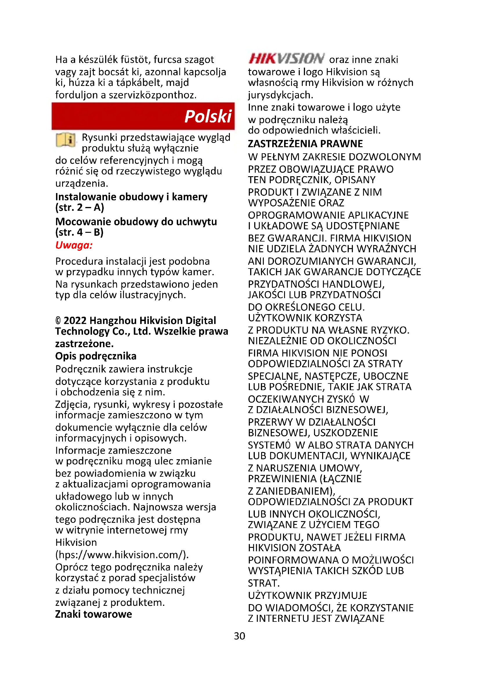 Zalecenia dotyczące bezpieczeństwa Ostrzeżenia Przepisy i rozporządzenia Urządzenie powinno być użytkowane zgodnie z lokalnymi przepisami, rozporządzeniami dotyczącymi korzystania z wyposażenia elektrycznego i przepisami przeciwpożarowymi. Bezpieczeństwo elektryczne PRZESTROGA: Aby ograniczyć zagrożenie pożarowe, należy używać bezpieczników tego samego typu i o takich samych parametrach znamionowych. Przestrogi Ochrona przeciwpożarowa Nie wolno umieszczać na urządzeniu źródeł nieosłoniętego płomienia, takich jak zapalone świece. Instalacja Urządzenie należy zainstalować zgodnie z instrukcjami podanymi w tym podręczniku. Aby zapobiec zranieniu, należy przymocować urządzenie do sufitu/ściany zgodnie z instrukcjami instalacyjnymi. Należy upewnić się, że dostępne jest32 miejsce wymagane do instalacji urządzenia i akcesoriów. Należy upewnić się, że ściana jest przystosowana do obciążenia co najmniej ośmiokrotnie większego niż ciężar urządzenia z uchwytem. Przed podłączeniem, instalacją lub demontażem urządzenia należy odłączyć zasilanie urządzenia. Transport Podczas transportu urządzenie powinno być umieszczone w oryginalnym lub podobnym opakowaniu. Należy chronić urządzenie przed upadkiem lub udarami mechanicznymi. Zasilanie Należy korzystać z zasilaczy dostarczonych przez wykwalifikowanych producentów. Zalecane jest użycie oddzielnego zasilacza dla każdego urządzenia, ponieważ przeciążenie zasilacza może spowodować przegrzanie lub pożar. Konserwacja Jeżeli produkt nie działa prawidłowo, skontaktuj się z dystrybutorem lub najbliższym centrum serwisowym. Producent nie ponosi odpowiedzialności za problemy spowodowane przez nieautoryzowane prace naprawcze lub konserwacyjne. Konieczna jest regularna wymiana kilku podzespołów urządzenia. Przeciętny okres użytkowania może być różny, dlatego zalecane jest regularne sprawdzanie stanu technicznego podzespołów. Aby uzyskać więcej informacji, należy skontaktować się z dystrybutorem. Czyszczenie Należy czyścić elementy wewnętrzne i zewnętrzne miękką, suchą ściereczką. Nie wolno stosować zasadowych środków czyszczących. Warunki otoczenia Jeżeli używane jest wyposażenie laserowe, należy upewnić się, że obiektyw urządzenia nie jest oświetlany przez wiązkę lasera, ponieważ może to spowodować jego spalenie. Nie wolno kierować otworu w obudowie w stronę słońca lub innego źródła intensywnego światła. Aby zapobiec akumulacji ciepła, należy zapewnić odpowiednią wentylację urządzenia. NIE wolno narażać urządzenia na ekstremalnie wysokie lub niskie temperatury, kurz, substancje korozyjne, roztwory soli, zasady lub wilgoć. Aby ustalić wymagania dotyczące temperatury i wilgotności, skorzystaj ze specyfikacji urządzenia. Należy chronić urządzenie przed silnym promieniowaniem elektromagnetycznym. Poważne awarie Jeżeli urządzenie wydziela dym lub intensywny zapach albo emituje hałas, należy niezwłocznie wyłączyć zasilanie i odłączyć przewód zasilający, a następnie skontaktować się z centrum serwisowym. Română Aspectul produsului este doar de referinţă şi poate varia de produsul real. Instalarea carcasei şi a camerei (Pagina 2 - A) Instalarea carcasei la suport (Pagina 4 - B) Notă: Paşii de instalare pentru diferite tipuri de camere sunt similare. Diagramele folosesc un singur tip pentru ilustrare.33 © 2022 Hangzhou Hikvision Digital Technology Co., Ltd. Toate drepturile rezervate. Despre acest Manual Manualul include instrucţiuni pentru utilizarea şi gestionarea Produsului. Fotografiile, diagramele, imaginile şi toate celelalte informaţii de mai jos sunt doar pentru descriere şi explicaţii. Informaţiile conţinute în Manualul pot fi modificate, fără notificare prealabilă, din cauza actualizărilor firmware-ului sau din alte motive. Vă rugăm să găsiţi cea mai recentă versiune a acestui manual pe site-ul web Hikvision (https://www.hikvision.com/). Vă rugăm să folosiţi acest Manual sub îndrumarea şi cu asistenţa unor profesionişti instruiţi în domeniul asistenţei pentru produs. Mărci comerciale şi alte mărci comerciale şi logo-uri Hikvision sunt proprietatea Hikvision în diferite jurisdicţii. Alte mărci comerciale şi logo-uri menţionate sunt proprietăţile proprietarilor respectivi. DISCLAIMER