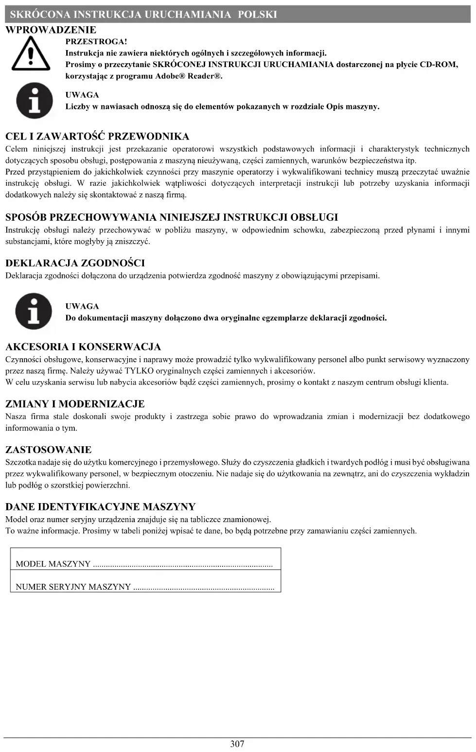UWAGA Do dokumentacji maszyny dołączono dwa oryginalne egzemplarze deklaracji zgodności.