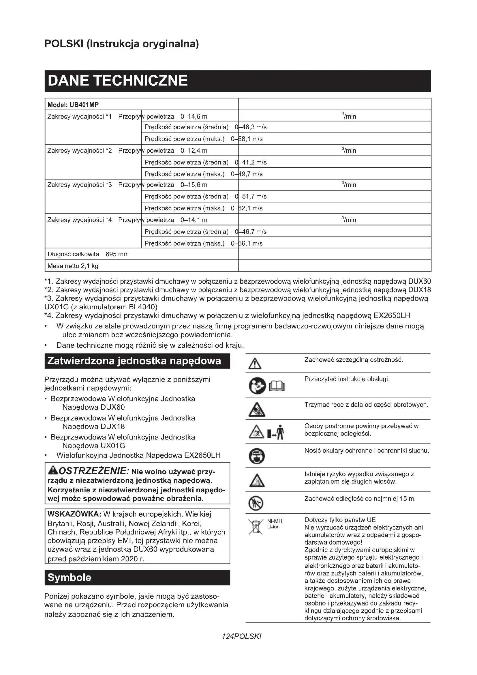 - WielofunkcyjnaJednostkaNapędowaEX2650LH OSTRZEŻENIE: Nie wolno używać przy- rządu z niezatwierdzoną jednostką napędową. Korzystanie z niezatwierdzonej jednostki napędo- wej może spowodować poważne obrażenia. WSKAZÓWKA: W krajach europejskich, Wielkiej Brytanii, Rosji, Australii, Nowej Zelandii, Korei, Chinach,RepublicePołudniowejAfrykiitp.,wktórych obowiązująprzepisyEMI,tejprzystawkiniemożna używaćwrazzjednostkąDUX60wyprodukowaną przedpaździernikiem2020r. Symbole Poniżejpokazanosymbole,jakiemogąbyćzastoso- wanenaurządzeniu.Przedrozpoczęciemużytkowania należyzapoznaćsięzichznaczeniem. Zachowaćszczególnąostrożność. Przeczytaćinstrukcjęobsługi. Trzymaćręcezdalaodczęściobrotowych. Osobypostronnepowinnyprzebywaćw bezpiecznejodległości. Nosićokularyochronneiochronnikisłuchu. Istniejeryzykowypadkuzwiązanegoz zaplątaniemsiędługichwłosów. Zachowaćodległośćconajmniej15m. Ni-MH Li-ion DotyczytylkopaństwUE Niewyrzucaćurządzeńelektrycznychani akumulatorów wraz z odpadami z gospo- darstwa domowego! Zgodnie z dyrektywami europejskimi w sprawiezużytegosprzętuelektrycznegoi elektronicznego oraz baterii i akumulato- róworazzużytychbateriiiakumulatorów, atakżedostosowaniemichdoprawa krajowego,zużyteurządzeniaelektryczne, baterieiakumulatory,należyskładować osobnoiprzekazywaćdozakładurecy- klingudziałającegozgodniezprzepisami dotyczącymiochronyśrodowiska.125 POLSKI Przeznaczenie Przystawkimożnaużywaćwyłączniedowydmuchi- waniapyłuwpołączeniuzzatwierdzonąjednostką napędową.Nigdynieużywaćtejprzystawkidoinnych celów.Nieprawidłowekorzystaniezprzystawkimoże doprowadzićdopoważnychobrażeń. Deklaracja zgodności WE Dotyczy tylko krajów europejskich Jako producenci: Makita Europe N.V.,adresrmy: Jan-Baptist Vinkstraat 2 3070 Kortenberg, BELGIA. UpoważniamyHiroshi Tsujimura do przygotowania dokumentacjitechnicznejinawłasnąodpowiedzialność oświadczamy,żeprodukty: Oznaczenie: Dmuchawa - Przystawka. Oznaczenie typu(-ów): UB401MP. Spełniająwszystkieodnośnepostanowieniadyrek- tywy 2006/42/WE,jakrównieżspełniająwszystkie odnośnepostanowienianastępującychdyrektyw WE/UE: 2000/14/WEisąprodukowanewsposób zgodnyznastępującyminormamizharmonizo- wanymi: EN 15503:2009+A1:2013+A2:2015, EN 50636-2-100:2014. Miejsce i data deklaracji: Kortenberg, Belgia. 29. 10. 2020 Osoba odpowiedzialna: Hiroshi Tsujimura, Dyrektor — Makita Europe N.V. OSTRZEŻENIA DOTYCZĄCE BEZPIECZEŃSTWA Instrukcje bezpieczeństwa dotyczące eksploatacji dmuchawy OSTRZEŻENIE: Przed rozpoczęciem eks- ploatacji maszyny należy przeczytać wszystkie ostrzeżenia, instrukcje i dane techniczne, a także zapoznać się z wszystkimi ilustracjami dostarczo- nymi z maszyną, jak również z instrukcją obsługi jednostki napędowej.Niezastosowaniesiędopoda- nychponiżejinstrukcjimożeprowadzićdoporażenia prądem,pożarui/lubpoważnychobrażeńciałaopera- tora i/lub osób postronnych. Wszystkie ostrzeżenia i instruk- cje należy zachować do wykorzy- stania w przyszłości. Określenia„szczotkaobrotowa/zamiatarka”oraz „maszyna”wostrzeżeniachiśrodkachbezpieczeństwa dotycząprzyrządupołączonegozjednostkąnapędową. Określenie„silnik”wostrzeżeniachiśrodkachostroż- nościdotyczysilnikaspalinowegolubsilnikaelektrycz- negojednostkinapędowej. Informacje podstawowe