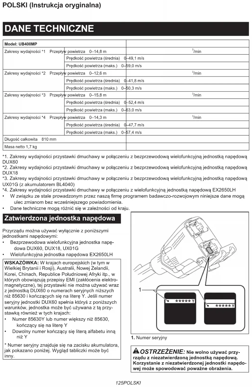 /min Prędkośćpowietrza(średnia) 0–47,7 m/sPrędkośćpowietrza(maks.) 0–57,4 m/sDługośćcałkowita 810 mmMasa netto 1,7 kg*1.ZakresywydajnościprzystawkidmuchawywpołączeniuzbezprzewodowąwielofunkcyjnąjednostkąnapędowąDUX60*2.ZakresywydajnościprzystawkidmuchawywpołączeniuzbezprzewodowąwielofunkcyjnąjednostkąnapędowąDUX18*3.ZakresywydajnościprzystawkidmuchawywpołączeniuzbezprzewodowąwielofunkcyjnąjednostkąnapędowąUX01G (z akumulatorem BL4040)*4.ZakresywydajnościprzystawkidmuchawywpołączeniuzwielofunkcyjnąjednostkąnapędowąEX2650LH• Wzwiązkuzestaleprowadzonymprzeznasząrmęprogramembadawczo-rozwojowymniniejszedanemogąuleczmianombezwcześniejszegopowiadomienia.• Danetechnicznemogąróżnićsięwzależnościodkraju. Zatwierdzona jednostka napędowa Przyrządumożnaużywaćwyłączniezponiższymijednostkaminapędowymi:• Bezprzewodowawielofunkcyjnajednostkanapę-dowa DUX60, DUX18, UX01G• WielofunkcyjnajednostkanapędowaEX2650LHWSKAZÓWKA: W krajach europejskich (w tym w Wielkiej Brytanii i Rosji), Australii, Nowej Zelandii, Korei,Chinach,RepublicePołudniowejAfrykiitp.,wktórychobowiązująprzepisyEMI(zakłóceniaelektro-magnetyczne),tejprzystawkiniemożnaużywaćwrazzjednostkąDUX60onumerachseryjnychniższychniż85630ikończącychsięnaliteręY.JeślinumerseryjnyjednostkiDUX60spełniaktóryśzponiższychwarunków,jednostkamożebyćużywanaztąprzy-stawkąrównieżwtychkrajach:• Numer85630Ylubnumerwiększyniż85630,kończącysięnaliteręY• DowolnynumerkończącysięliterąalfabetuinnąniżY*Numerseryjnyznajdujesięnazaciskuakumulatora,jakpokazanoponiżej.Wyglądtabliczkimożebyćinny.