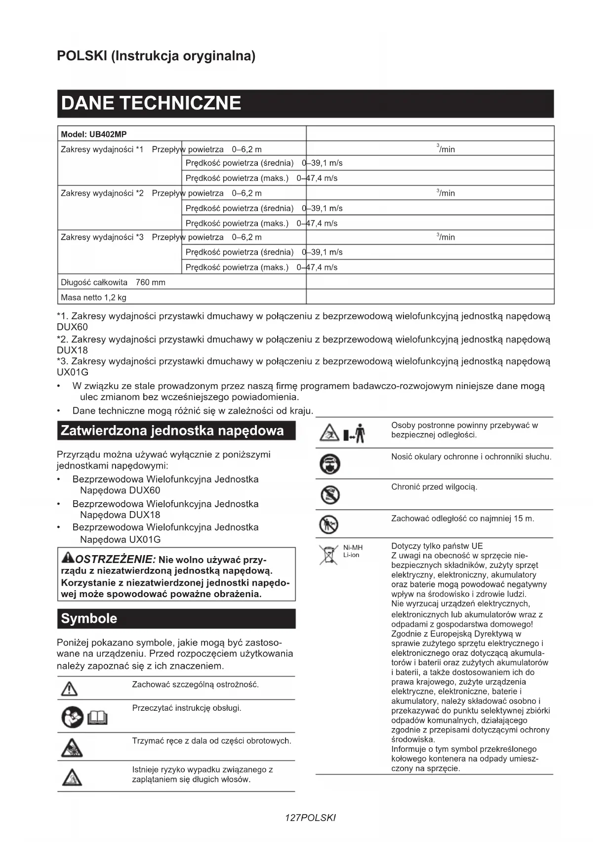 - BezprzewodowaWielofunkcyjnaJednostka NapędowaUX01G OSTRZEŻENIE: Nie wolno używać przy- rządu z niezatwierdzoną jednostką napędową. Korzystanie z niezatwierdzonej jednostki napędo- wej może spowodować poważne obrażenia. Symbole Poniżejpokazanosymbole,jakiemogąbyćzastoso- wanenaurządzeniu.Przedrozpoczęciemużytkowania należyzapoznaćsięzichznaczeniem. Zachowaćszczególnąostrożność. Przeczytaćinstrukcjęobsługi. Trzymaćręcezdalaodczęściobrotowych. Istniejeryzykowypadkuzwiązanegoz zaplątaniemsiędługichwłosów. Osobypostronnepowinnyprzebywaćw bezpiecznejodległości. Nosićokularyochronneiochronnikisłuchu. Chronićprzedwilgocią. Zachowaćodległośćconajmniej15m. Ni-MH Li-ion DotyczytylkopaństwUE Zuwaginaobecnośćwsprzęcienie- bezpiecznychskładników,zużytysprzęt elektryczny,elektroniczny,akumulatory orazbateriemogąpowodowaćnegatywny wpływnaśrodowiskoizdrowieludzi. Niewyrzucajurządzeńelektrycznych, elektronicznychlubakumulatorówwrazz odpadami z gospodarstwa domowego! ZgodniezEuropejskąDyrektywąw sprawiezużytegosprzętuelektrycznegoi elektronicznegoorazdotyczącąakumula- torówibateriiorazzużytychakumulatorów ibaterii,atakżedostosowaniemichdo prawakrajowego,zużyteurządzenia elektryczne,elektroniczne,bateriei akumulatory,należyskładowaćosobnoi przekazywaćdopunktuselektywnejzbiórki odpadówkomunalnych,działającego zgodniezprzepisamidotyczącymiochrony środowiska. Informujeotymsymbolprzekreślonego kołowegokonteneranaodpadyumiesz- czonynasprzęcie.128 POLSKI Przeznaczenie Przystawkimożnaużywaćwyłączniedowydmuchi- waniapyłuwpołączeniuzzatwierdzonąjednostką napędową.Nigdynieużywaćtejprzystawkidoinnych celów.Nieprawidłowekorzystaniezprzystawkimoże doprowadzićdopoważnychobrażeń. Deklaracja zgodności WE Dotyczy tylko krajów europejskich Jako producenci: Makita Europe N.V.,adresrmy: Jan-Baptist Vinkstraat 2 3070 Kortenberg, BELGIA. UpoważniamyHiroshi Tsujimuradoprzygotowania dokumentacjitechnicznejinawłasnąodpowiedzialność oświadczamy,żeprodukty: Oznaczenie: Dmuchawa - Przystawka. Oznaczenie typu(-ów):UB402MP. Spełniająwszystkieodnośnepostanowieniadyrek- tywy2006/42/WE,jakrównieżspełniająwszystkie odnośnepostanowienianastępującychdyrektywWE/ UE:2000/14/WEisąprodukowanewsposóbzgodny znastępującyminormamizharmonizowanymi:EN 60335-1:2012+A11:2014+A13:2017+A1:2019+A14:20 19+A2:2019, EN 50636-2-100:2014. Miejsce i data deklaracji: Kortenberg, Belgia.