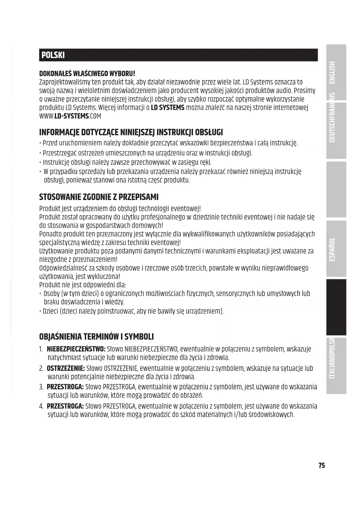 Adam Hall GmbH, Adam-Hall-Str. 1, D-61267 Neu Anspach / E-Mail Info@adamhall.com / +49 (0)6081 / 9419-0. Nasze aktualne warunki gwarancji i ograniczenia odpowiedzialności znajdują się na stronie: https://cdn-shop.adamhall.com/media/pdf/MANUFACTURERS-DECLARATIONS_LD_SYSTEMS.pdf. W przypadku serwisu prosimy o kontakt z partnerem handlowym. ZGODNOŚĆ CE Adam Hall GmbH oświadcza niniejszym, że ten produkt jest zgodny z następującą dyrektywą (jeśli dotyczy). R&TTE (1999/5/EC) lub RED (2014/53/EU) od czerwca 2017 r. Dyrektywa niskonapięciowa (2014/35/UE) Dyrektywa EMV (2014/30/UE) RoHS (2011/65/EU) Pełna deklaracja zgodności znajduje się na stronie www.adamhall.com. Ponadto można ją również zamówić na stronie info@adamhall.com.