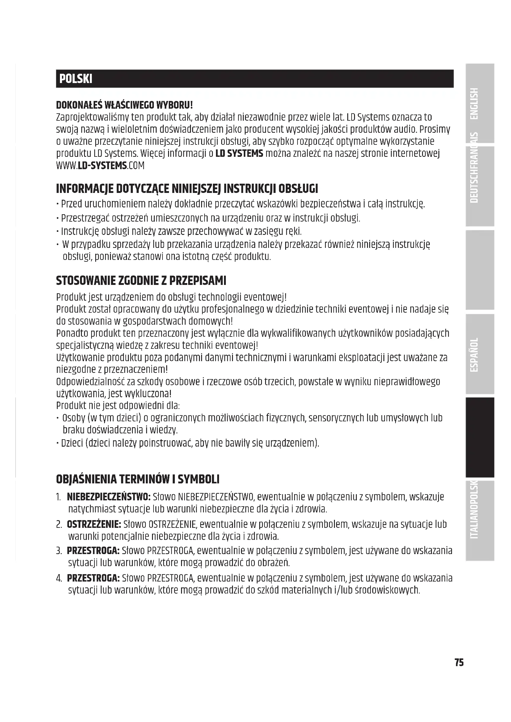 Adam Hall GmbH, Adam-Hall-Str. 1, D-61267 Neu Anspach / E-Mail Info@adamhall.com / +49 (0)6081 / 9419-0. Nasze aktualne warunki gwarancji i ograniczenia odpowiedzialności znajdują się na stronie: https://cdn-shop.adamhall.com/media/pdf/MANUFACTURERS-DECLARATIONS_LD_SYSTEMS.pdf. W przypadku serwisu prosimy o kontakt z partnerem handlowym. ZGODNOŚĆ CE Adam Hall GmbH oświadcza niniejszym, że ten produkt jest zgodny z następującą dyrektywą (jeśli dotyczy). R&TTE (1999/5/EC) lub RED (2014/53/EU) od czerwca 2017 r. Dyrektywa niskonapięciowa (2014/35/UE) Dyrektywa EMV (2014/30/UE) RoHS (2011/65/EU) Pełna deklaracja zgodności znajduje się na stronie www.adamhall.com. Ponadto można ją również zamówić na stronie info@adamhall.com.