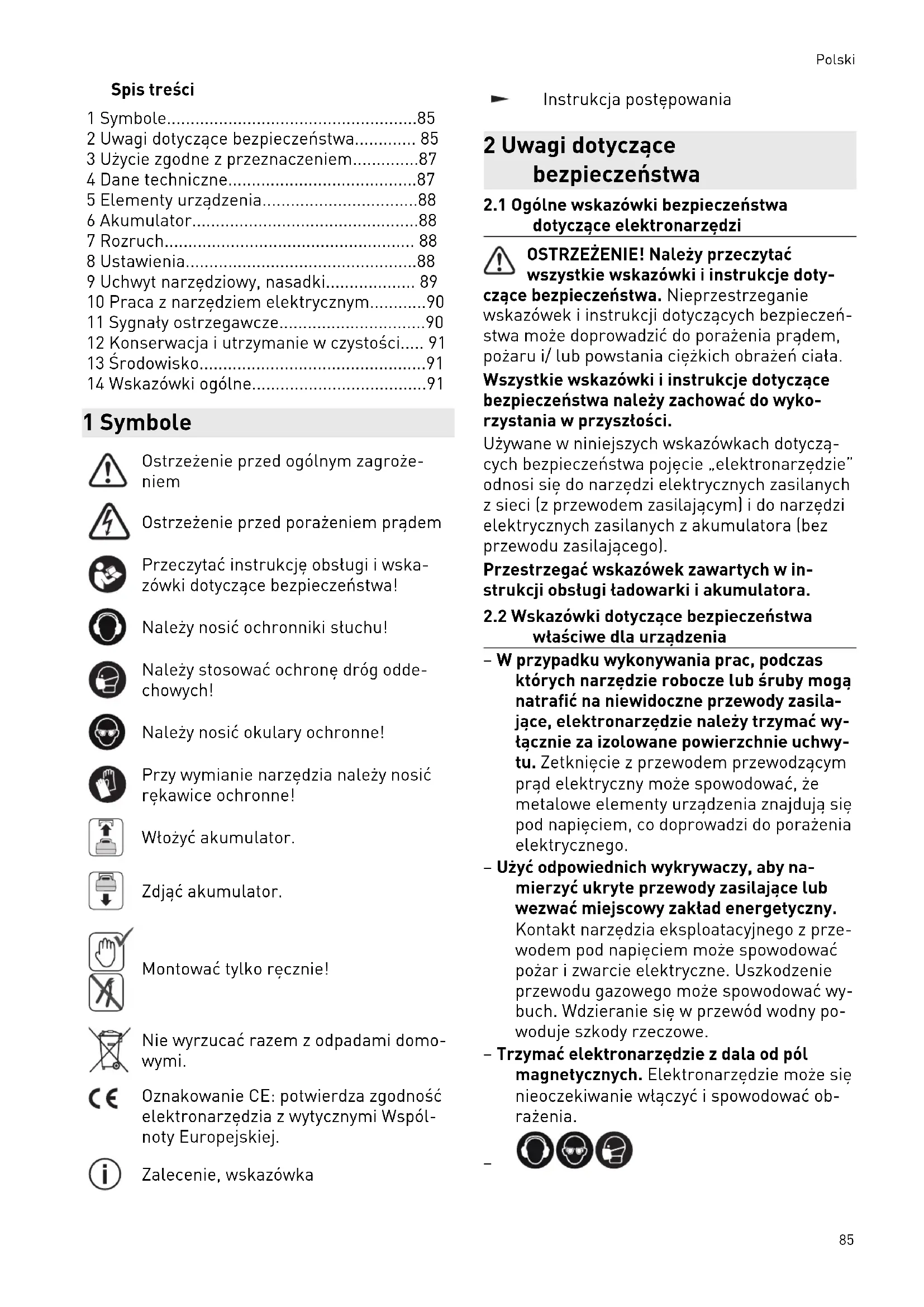 - 14 Wskazówki ogólne 1 Symbole Ostrzeżenie przed ogólnym zagroże niem Ostrzeżenie przed porażeniem prądem Przeczytać instrukcję obsługi i wska zówki dotyczące bezpieczeństwa! Należy nosić ochronniki słuchu! Należy stosować ochronę dróg odde chowych! Należy nosić okulary ochronne! Przy wymianie narzędzia należy nosić rękawice ochronne! Włożyć akumulator. Zdjąć akumulator. Montować tylko ręcznie! Nie wyrzucać razem z odpadami domo wymi. Oznakowanie CE: potwierdza zgodność elektronarzędzia z wytycznymi Wspól noty Europejskiej. Zalecenie, wskazówka Instrukcja postępowania 2 Uwagi dotyczące bezpieczeństwa p. 91