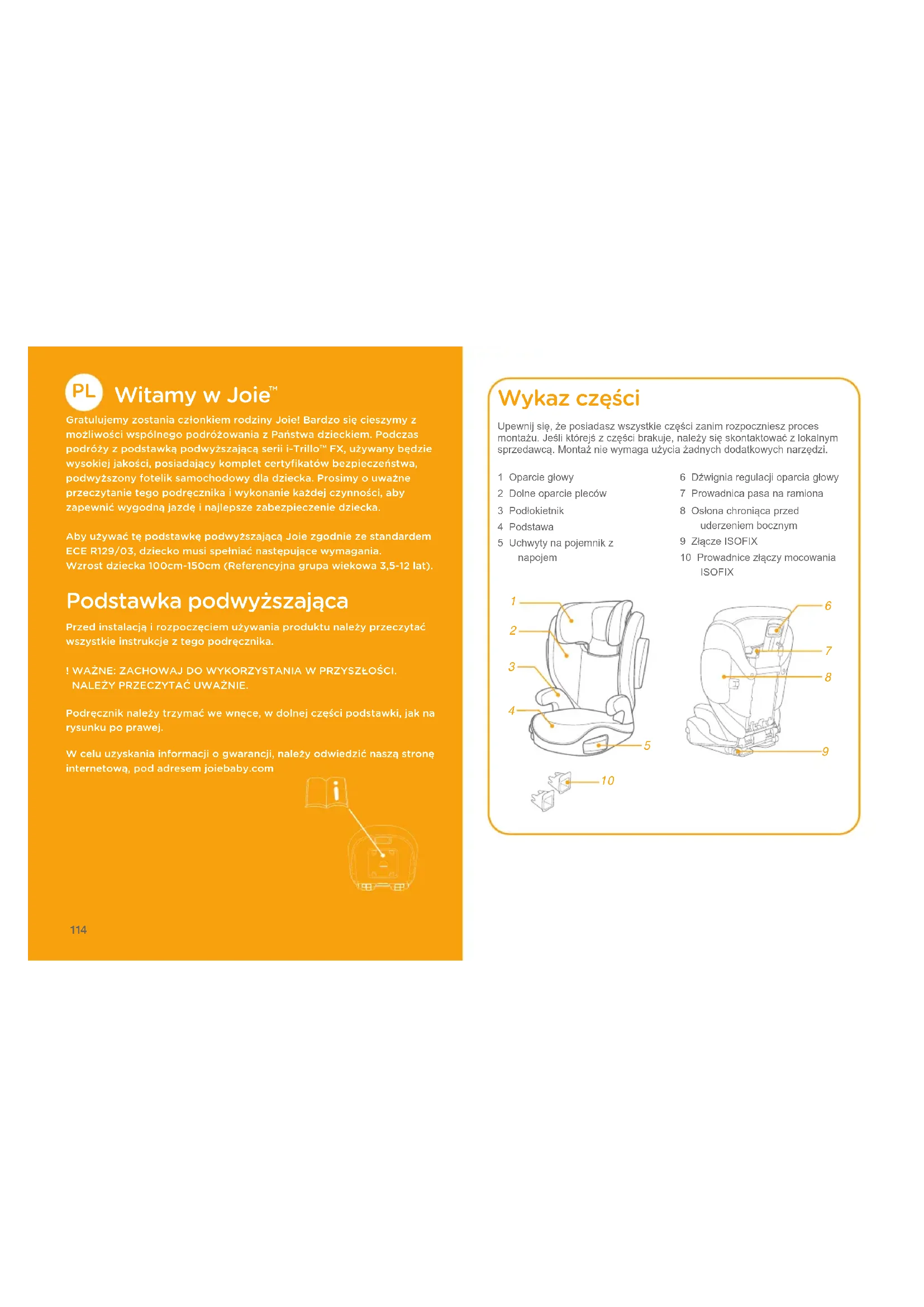Gratulujemy zostania członkiem rodziny Joie! Bardzo się cieszymy z możliwości wspólnego podróżowania z Państwa dzieckiem. Podczas podróży z podstawką podwyższającą serii i-Trillo™ FX, używany będzie wysokiej jakości, posiadający komplet certyfikatów bezpieczeństwa, podwyższony fotelik samochodowy dla dziecka. Prosimy o uważne przeczytanie tego podręcznika i wykonanie każdej czynności, aby zapewnić wygodną jazdę i najlepsze zabezpieczenie dziecka.Aby używać tę podstawkę podwyższającą Joie zgodnie ze standardem ECE R129/03, dziecko musi spełniać następujące wymagania.Wzrost dziecka 100cm-150cm (Referencyjna grupa wiekowa 3,5-12 lat). Podstawka podwyższająca Przed instalacją i rozpoczęciem używania produktu należy przeczytać wszystkie instrukcje z tego podręcznika.! WAŻNE: ZACHOWAJ DO WYKORZYSTANIA W PRZYSZŁOŚCI. NALEŻY PRZECZYTAĆ UWAŻNIE.Podręcznik należy trzymać we wnęce, w dolnej części podstawki, jak na rysunku po prawej.W celu uzyskania informacji o gwarancji, należy odwiedzić naszą stronę internetową, pod adresem joiebaby.com
