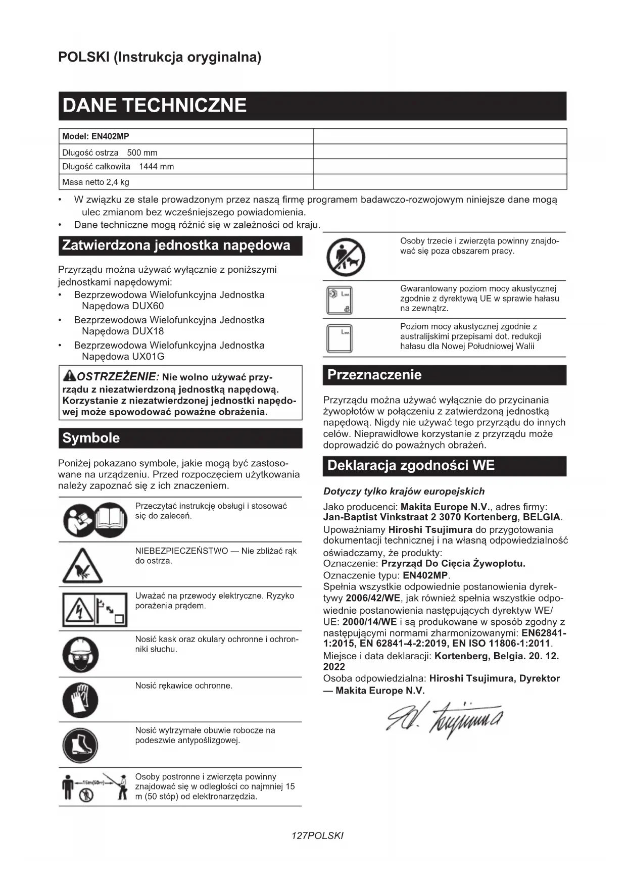- BezprzewodowaWielofunkcyjnaJednostka NapędowaUX01G OSTRZEŻENIE: Nie wolno używać przy- rządu z niezatwierdzoną jednostką napędową. Korzystanie z niezatwierdzonej jednostki napędo- wej może spowodować poważne obrażenia. Symbole Poniżejpokazanosymbole,jakiemogąbyćzastoso- wanenaurządzeniu.Przedrozpoczęciemużytkowania należyzapoznaćsięzichznaczeniem. Przeczytaćinstrukcjęobsługiistosować siędozaleceń. NIEBEZPIECZEŃSTWO—Niezbliżaćrąk do ostrza. Uważaćnaprzewodyelektryczne.Ryzyko porażeniaprądem. Nosićkaskorazokularyochronneiochron- nikisłuchu. Nosićrękawiceochronne. Nosićwytrzymałeobuwieroboczena podeszwieantypoślizgowej. Osobypostronneizwierzętapowinny znajdowaćsięwodległościconajmniej15 m(50stóp)odelektronarzędzia. Osobytrzecieizwierzętapowinnyznajdo- waćsiępozaobszarempracy. Gwarantowanypoziommocyakustycznej zgodniezdyrektywąUEwsprawiehałasu nazewnątrz. Poziommocyakustycznejzgodniez australijskimiprzepisamidot.redukcji hałasudlaNowejPołudniowejWalii Przeznaczenie Przyrządumożnaużywaćwyłączniedoprzycinania żywopłotówwpołączeniuzzatwierdzonąjednostką napędową.Nigdynieużywaćtegoprzyrządudoinnych celów.Nieprawidłowekorzystaniezprzyrządumoże doprowadzićdopoważnychobrażeń. Deklaracja zgodności WE Dotyczy tylko krajów europejskich Jako producenci: Makita Europe N.V.,adresrmy: Jan-Baptist Vinkstraat 2 3070 Kortenberg, BELGIA. UpoważniamyHiroshi Tsujimuradoprzygotowania dokumentacjitechnicznejinawłasnąodpowiedzialność oświadczamy,żeprodukty: Oznaczenie: Przyrząd Do Cięcia Żywopłotu. Oznaczenietypu:EN402MP. Spełniawszystkieodpowiedniepostanowieniadyrek- tywy2006/42/WE,jakrównieżspełniawszystkieodpo- wiedniepostanowienianastępującychdyrektywWE/ UE: 2000/14/WEisąprodukowanewsposóbzgodnyz następującyminormamizharmonizowanymi:EN62841- 1:2015, EN 62841-4-2:2019, EN ISO 11806-1:2011. Miejsceidatadeklaracji:Kortenberg, Belgia. 20. 12.