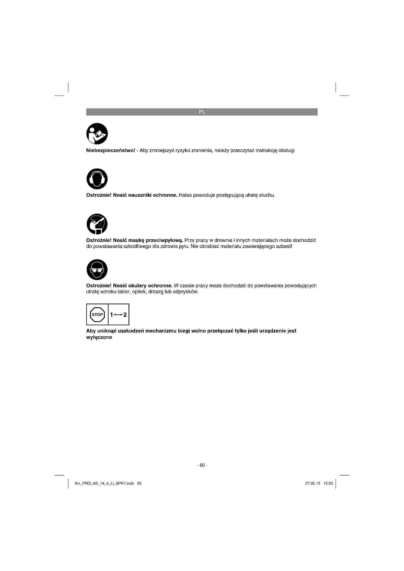 Niebezpieczeństwo! - Aby zmniejszyć ryzyko zranienia, należy przeczytać instrukcję obsługi Ostrożnie! Nosić nauszniki ochronne. Hałas powoduje postępującą utratę słuchu. Ostrożnie! Nosić okulary ochronne. W czasie pracy może dochodzić do powstawania powodujących utratę wzroku iskier, opiłek, drzazg lub odprysków. Ostrożnie! Nosić maskę przeciwpyłową. Przy pracy w drewnie i innych materiałach może dochodzić do powstawania szkodliwego dla zdrowia pyłu. Nie obrabiać materiału zawierającego azbest! Aby uniknąć uszkodzeń mechanizmu biegi wolno przełączać tylko jeśli urządzenie jest wyłączone Anl_PRO_AS_14_4_Li_SPK7.indb 60Anl_PRO_AS_14_4_Li_SPK7.indb 60 27.05.15 15:3527.05.15 15:35PL