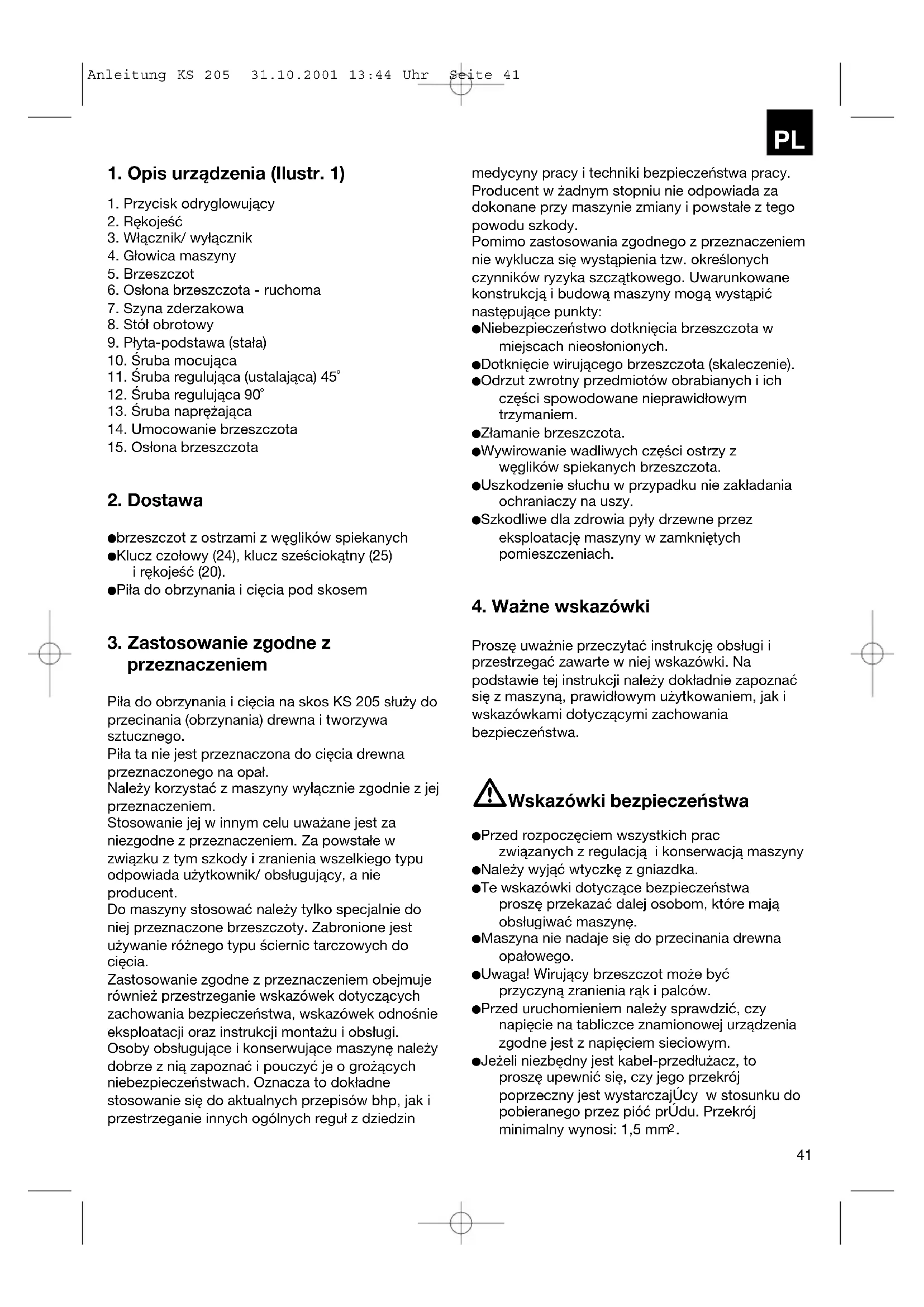 przeznaczeniem Piła do obrzynania i cięcia na skos KS 205 służy do przecinania (obrzynania) drewna i tworzywa sztucznego. Piła ta nie jest przeznaczona do cięcia drewna przeznaczonego na opał. Należy korzystać z maszyny wyłącznie zgodnie z jej przeznaczeniem. Stosowanie jej w innym celu uważane jest za niezgodne z przeznaczeniem. Za powstałe w związku z tym szkody i zranienia wszelkiego typu odpowiada użytkownik/ obsługujący, a nie producent. Do maszyny stosować należy tylko specjalnie do niej przeznaczone brzeszczoty. Zabronione jest używanie różnego typu ściernic tarczowych do cięcia. Zastosowanie zgodne z przeznaczeniem obejmuje również przestrzeganie wskazówek dotyczących zachowania bezpieczeństwa, wskazówek odnośnie eksploatacji oraz instrukcji montażu i obsługi. Osoby obsługujące i konserwujące maszynę należy dobrze z nią zapoznać i pouczyć je o grożących niebezpieczeństwach. Oznacza to dokładne stosowanie się do aktualnych przepisów bhp, jak i przestrzeganie innych ogólnych reguł z dziedzin medycyny pracy i techniki bezpieczeństwa pracy. Producent w żadnym stopniu nie odpowiada za dokonane przy maszynie zmiany i powstałe z tego powodu szkody. Pomimo zastosowania zgodnego z przeznaczeniem nie wyklucza się wystąpienia tzw. określonych czynników ryzyka szczątkowego. Uwarunkowane konstrukcją i budową maszyny mogą wystąpić następujące punkty: Niebezpieczeństwo dotknięcia brzeszczota w miejscach nieosłonionych. Dotknięcie wirującego brzeszczota (skaleczenie). Odrzut zwrotny przedmiotów obrabianych i ich części spowodowane nieprawidłowym trzymaniem. Złamanie brzeszczota. Wywirowanie wadliwych części ostrzy z węglików spiekanych brzeszczota. Uszkodzenie słuchu w przypadku nie zakładania ochraniaczy na uszy. Szkodliwe dla zdrowia pyły drzewne przez eksploatację maszyny w zamkniętych pomieszczeniach.