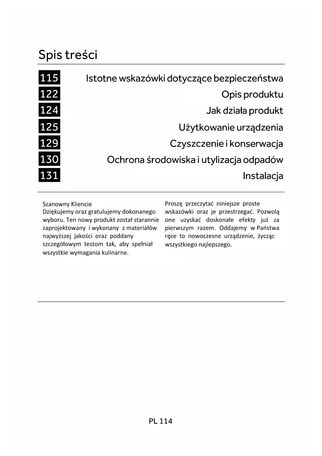 Szanowny Kliencie Dziękujemy oraz gratulujemy dokonanego wyboru. Ten nowy produkt został starannie zaprojektowany i wykonany z materiałów najwyższej jakości oraz poddany szczegółowym testom tak, aby spełniał wszystkie wymagania kulinarne. Proszę przeczytać niniejsze proste wskazówki oraz je przestrzegać. Pozwolą one uzyskać doskonałe efekty już za pierwszym razem. Oddajemy w Państwa ręce to nowoczesne urządzenie, życząc wszystkiego najlepszego.PL 115 Istotne wskazówki dotyczące bezpieczeństwa ŚRODKI OSTROŻNOŚCI ZAPOBIEGAJĄCE NARAŻENIU