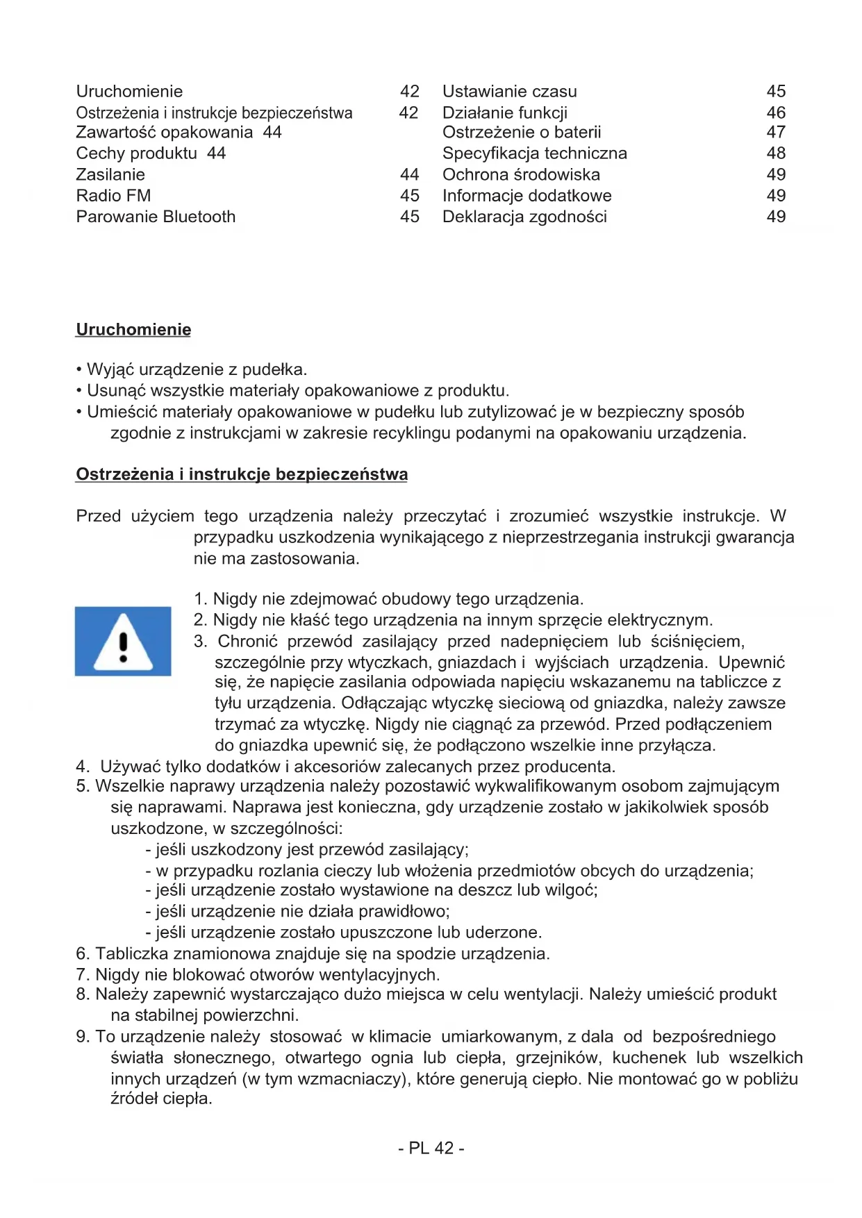 Zawartość opakowania 44 Cechy produktu 44 Zasilanie 44 Radio FM 45 Parowanie Bluetooth 45 Ustawianie czasu 45 Działanie funkcji 46 Ostrzeżenie o baterii 47 Specykacja techniczna 48 Ochrona środowiska 49 Informacje dodatkowe 49 Deklaracja zgodności 49- PL 43 -