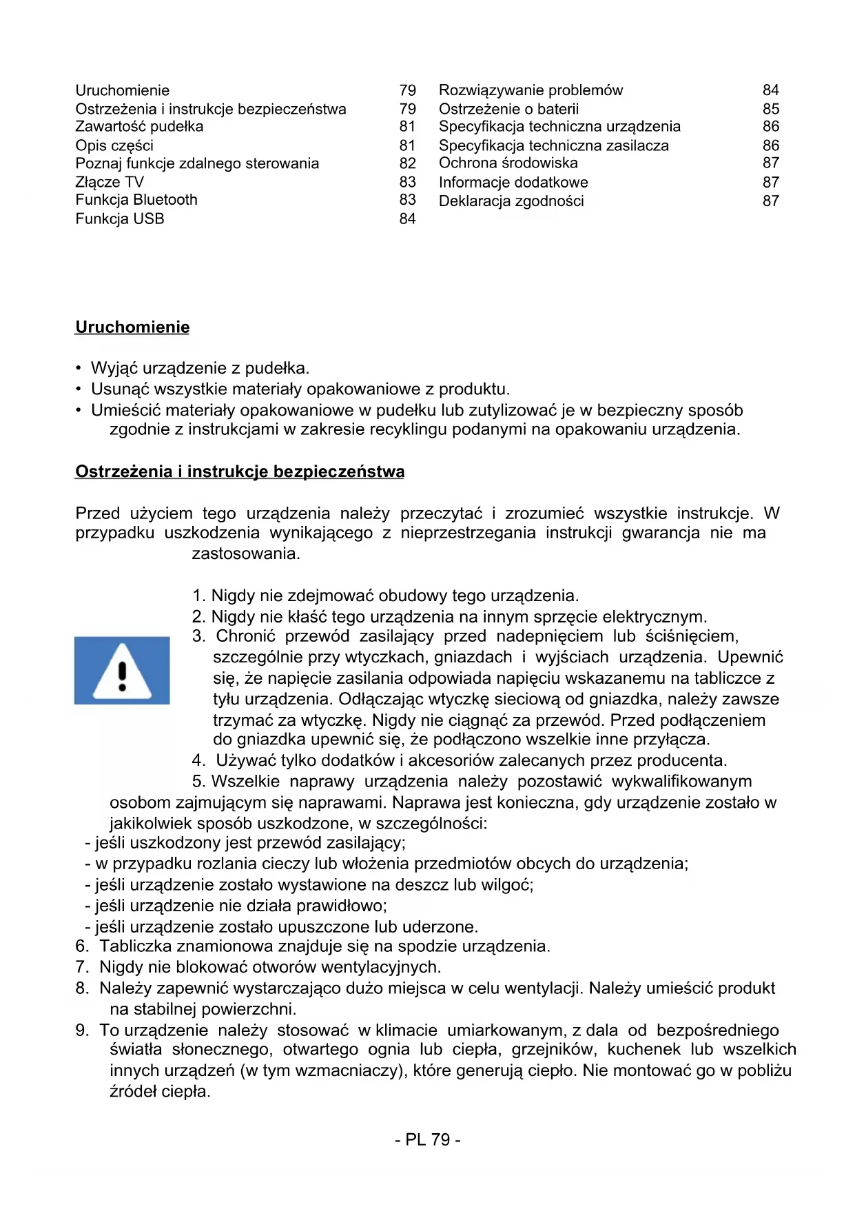 światła słonecznego, otwartego ognia lub ciepła, grzejników, kuchenek lub wszelkich innych urządzeń (w tym wzmacniaczy), które generują ciepło. Nie montować go w pobliżu źródeł ciepła. Uruchomienie 79 Ostrzeżenia i instrukcje bezpieczeństwa 79 Zawartość pudełka 81 Opis części 81 Poznaj funkcje zdalnego sterowania 82 Złącze TV 83 Funkcja Bluetooth 83 Funkcja USB 84 Rozwiązywanie problemów 84 Ostrzeżenie o baterii 85 Specykacja techniczna urządzenia 86 Specykacja techniczna zasilacza 86 Ochrona środowiska 87 Informacje dodatkowe 87 Deklaracja zgodności 87- PL 80 -