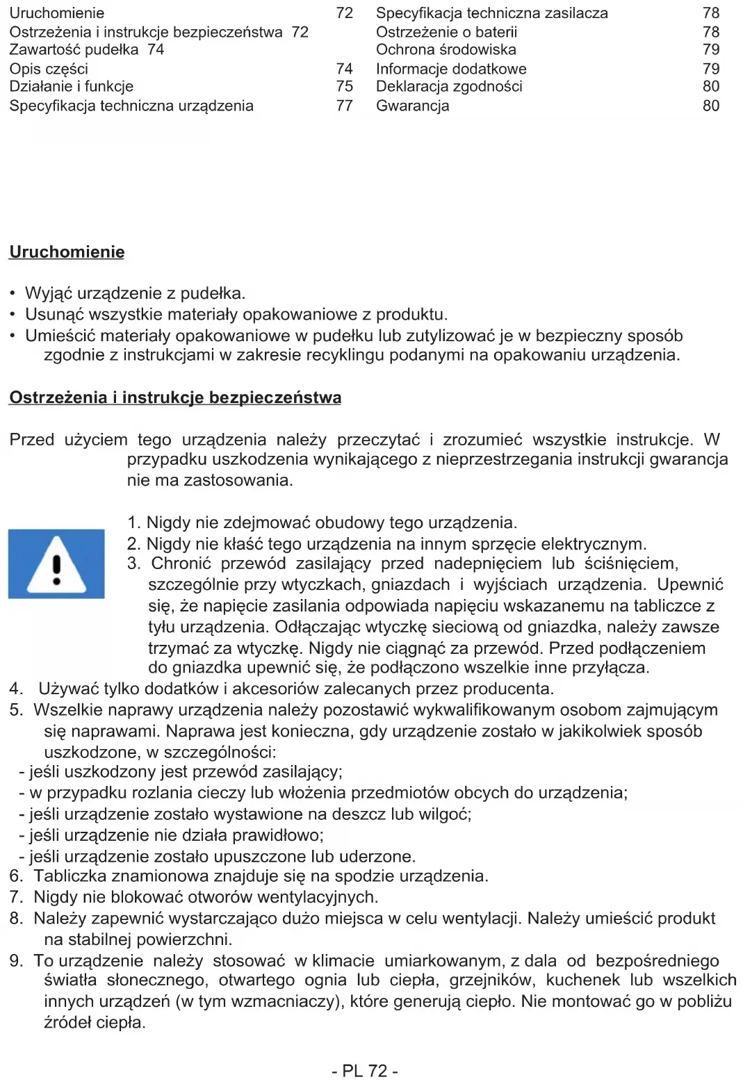 światła słonecznego, otwartego ognia lub ciepła, grzejników, kuchenek lub wszelkich innych urządzeń (w tym wzmacniaczy), które generują ciepło. Nie montować go w pobliżu źródeł ciepła. Uruchomienie 72 Ostrzeżenia i instrukcje bezpieczeństwa 72 Zawartość pudełka 74 Opis części 74 Działanie i funkcje 75 Specykacja techniczna urządzenia 77 Specykacja techniczna zasilacza 78 Ostrzeżenie o baterii 78 Ochrona środowiska 79 Informacje dodatkowe 79 Deklaracja zgodności 80 Gwarancja 80- PL 73 -