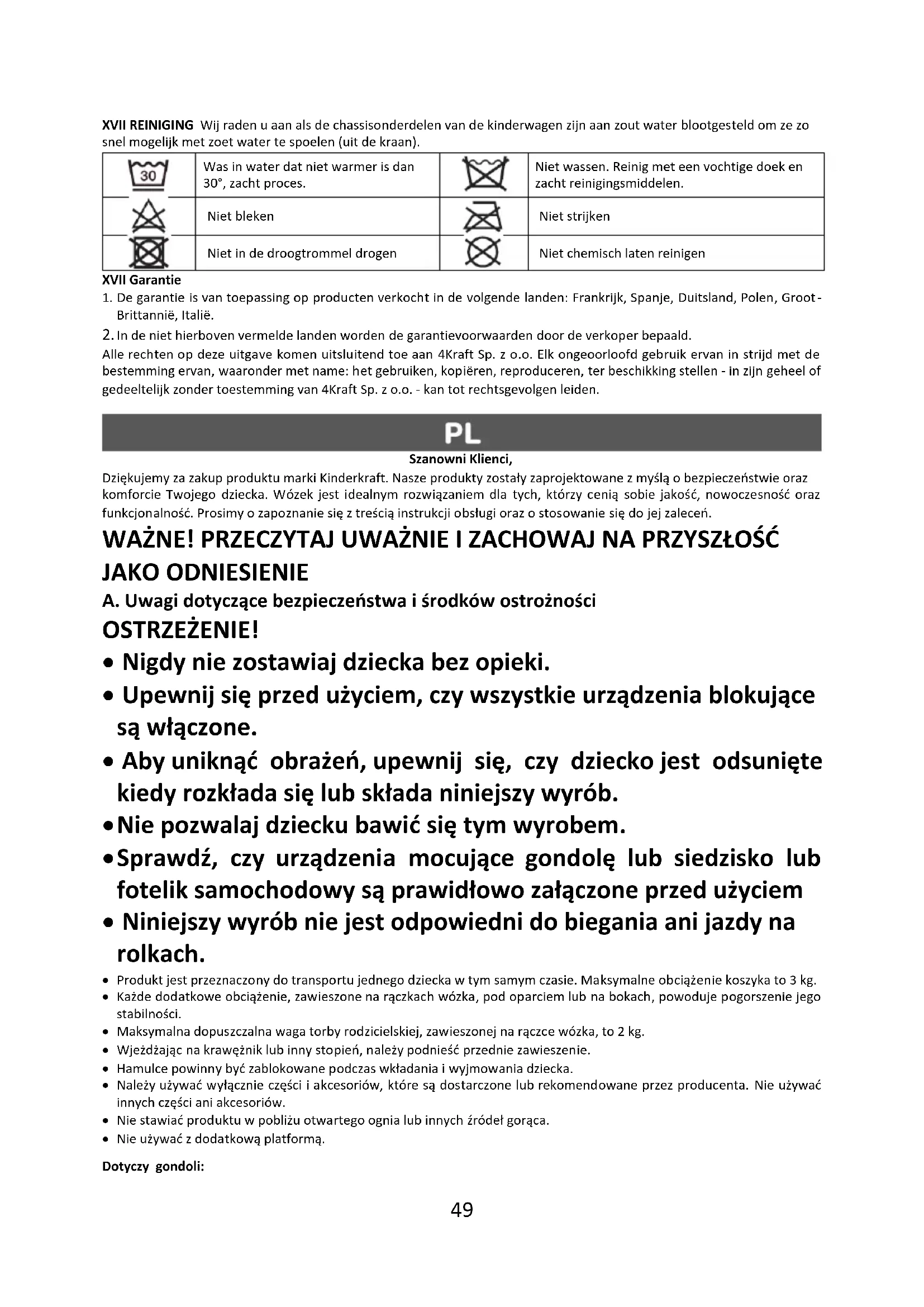 Alle rechten op deze uitgave komen uitsluitend toe aan 4Kraft Sp. z o.o. Elk ongeoorloofd gebruik ervan in strijd met de bestemming ervan, waaronder met name: het gebruiken, kopiëren, reproduceren, ter beschikking stellen - in zijn geheel of gedeeltelijk zonder toestemming van 4Kraft Sp. z o.o. - kan tot rechtsgevolgen leiden. Szanowni Klienci, Dziękujemy za zakup produktu marki Kinderkraft. Nasze produkty zostały zaprojektowane z myślą o bezpieczeństwie oraz komforcie Twojego dziecka. Wózek jest idealnym rozwiązaniem dla tych, którzy cenią sobie jakość, nowoczesność oraz funkcjonalność. Prosimy o zapoznanie się z treścią instrukcji obsługi oraz o stosowanie się do jej zaleceń. WAŻNE! PRZECZYTAJ UWAŻNIE I ZACHOWAJ NA PRZYSZŁOŚĆ JAKO ODNIESIENIE A. Uwagi dotyczące bezpieczeństwa i środków ostrożności OSTRZEŻENIE!