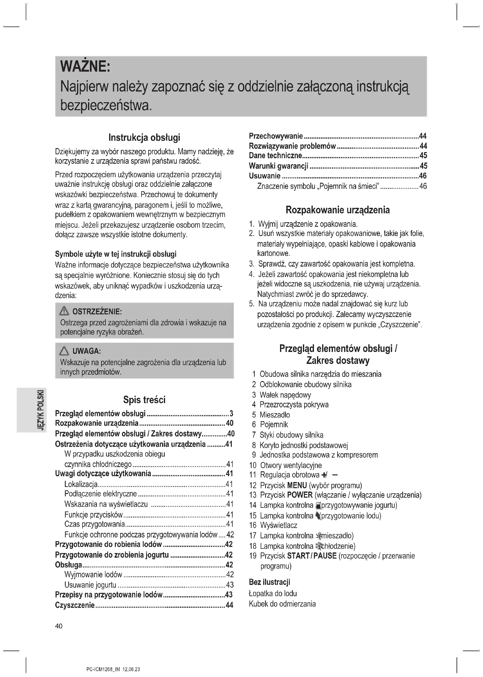 pozostałości po produkcji. Zalecamy wyczyszczenie urządzenia zgodnie z opisem w punkcie „Czyszczenie”. Przegląd elementów obsługi / Zakres dostawy 1 Obudowa silnika narzędzia do mieszania 2 Odblokowanie obudowy silnika 3 Wałek napędowy 4 Przezroczysta pokrywa 5 Mieszadło 6 Pojemnik 7 Styki obudowy silnika 8 Koryto jednostki podstawowej 9 Jednostka podstawowa z kompresorem 10 Otwory wentylacyjne 11 Regulacja obrotowa / 12 Przycisk MENU (wybór programu) 13 Przycisk POWER (włączanie / wyłączanie urządzenia) 14 Lampka kontrolna (przygotowywanie jogurtu) 15 Lampka kontrolna (przygotowanie lodu) 16 Wyświetlacz 17 Lampka kontrolna (mieszadło) 18 Lampka kontrolna (chłodzenie) 19 Przycisk START / PAUSE (rozpoczęcie / przerwanie programu) Bez ilustracji Łopatka do lodu Kubek do odmierzaniaPC-ICM1268_IM 12.06.23