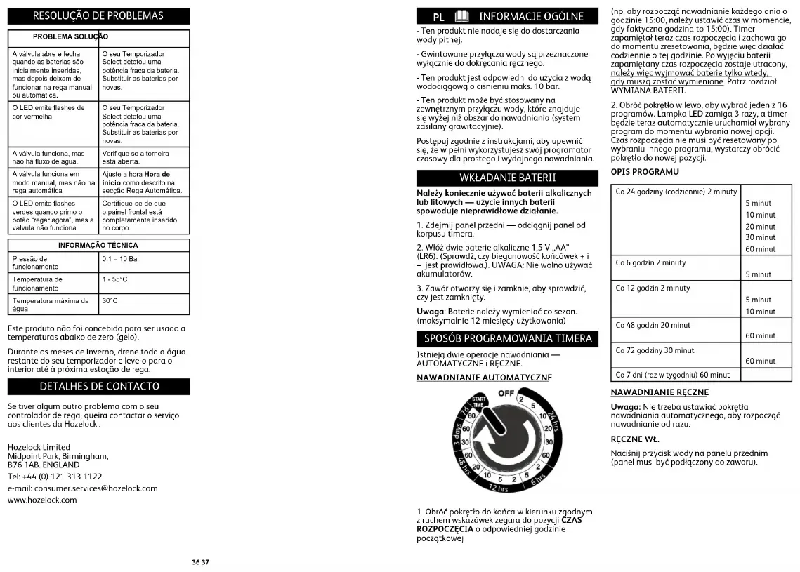 Zawór otwiera się i zamyka, kiedy baterie są włożone po raz pierwszy, ale następnie nie działa podczas nawadniania ręcznego lub automatycznego. Timer wykrył niski poziom naładowania baterii. Wymień baterie na nowe. Lampka LED miga na czerwono. Timer wykrył niski poziom naładowania baterii. Wymień baterie na nowe. Zawór działa, ale woda nie przepływa. Sprawdź, czy kurek jest otwarty. Zawór działa w trybie ręcznym, ale nie przy nawadnianiu automatycznym. Ustaw Czas początkowy zgodnie z opisem w rozdziale dotyczącym nawadniania automatycznego.. Lampka LED miga na zielono po naciśnięciu przycisku nawadniania, ale zawór nie działa. Upewnij się, że panel przedni jest całkowicie włożony w korpus urządzenia DANE TECHNICZNE Ciśnienie robocze 0.1 – 10 bar Temperatura robocza 1 – 55°C Maksymalna temperatura wody 30°C Produkt nie jest przeznaczony do wykorzystania w temperaturze poniżej zera (podczas mrozu). W miesiącach zimowych należy spuścić pozostałą wodę z timera i umieścić urządzenie w pomieszczeniu zadaszonym aż do następnego sezonu nawadniania. DANE KONTAKTOWE W razie jakichkolwiek problemów dotyczących sterownika wody należy skontaktować się z działem obsługi klienta firmy Hozelock. Hozelock Limited Midpoint Park, Birmingham,