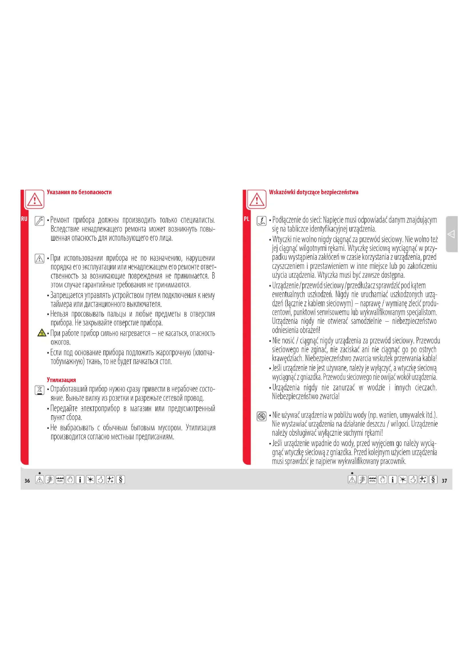 - Urządzenia nigdy nie zanurzać w wodzie i innych cieczach. Niebezpieczeństwo zwarcia! Указания по безопасности