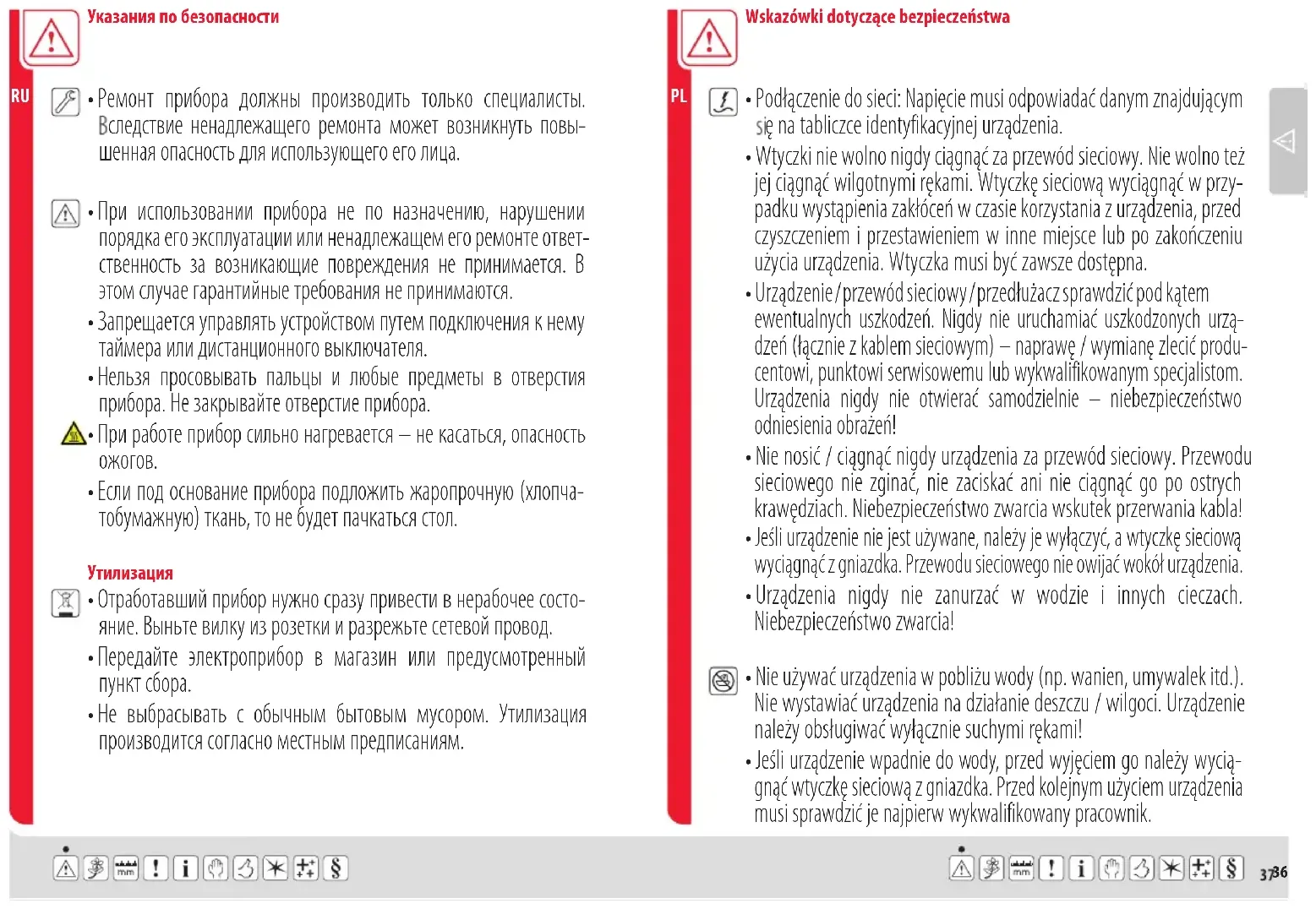 - Urządzenia nigdy nie zanurzać w wodzie i innych cieczach. Niebezpieczeństwo zwarcia! Указания по безопасности