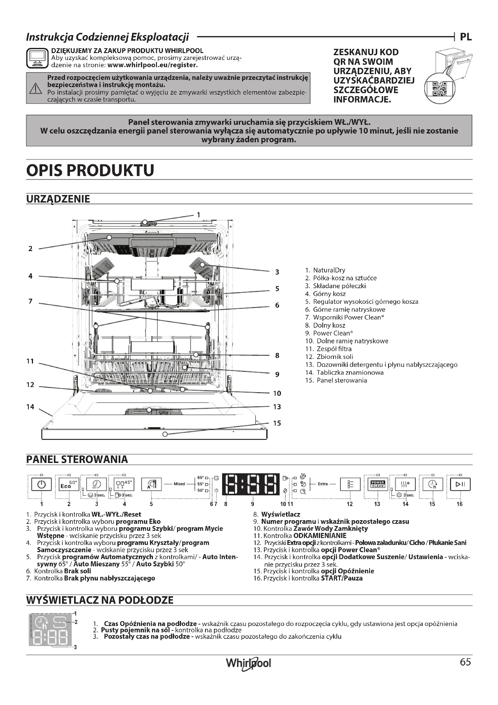 nie przycisku przez 3 sek.15. Przycisk i kontrolka opcji Opóźnienie16. Przycisk i kontrolka START/Pauza OPIS PRODUKTU Panel sterowania zmywarki uruchamia się przyciskiem WŁ./WYŁ. W celu oszczędzania energii panel sterowania wyłącza się automatycznie po upływie 10 minut, jeśli nie zostanie wybrany żaden program. URZĄDZENIE 1. NaturalDry2. Półka-kosz na sztućce3. Składane półeczki4. Górny kosz5. Regulator wysokości górnego kosza6. Górne ramię natryskowe7. Wsporniki Power Clean®8. Dolny kosz9. Power Clean®10. Dolne ramię natryskowe11. Zespół ltra12. Zbiornik soli13. Dozowniki detergentu i płynu nabłyszczającego14. Tabliczka znamionowa15. Panel sterowania