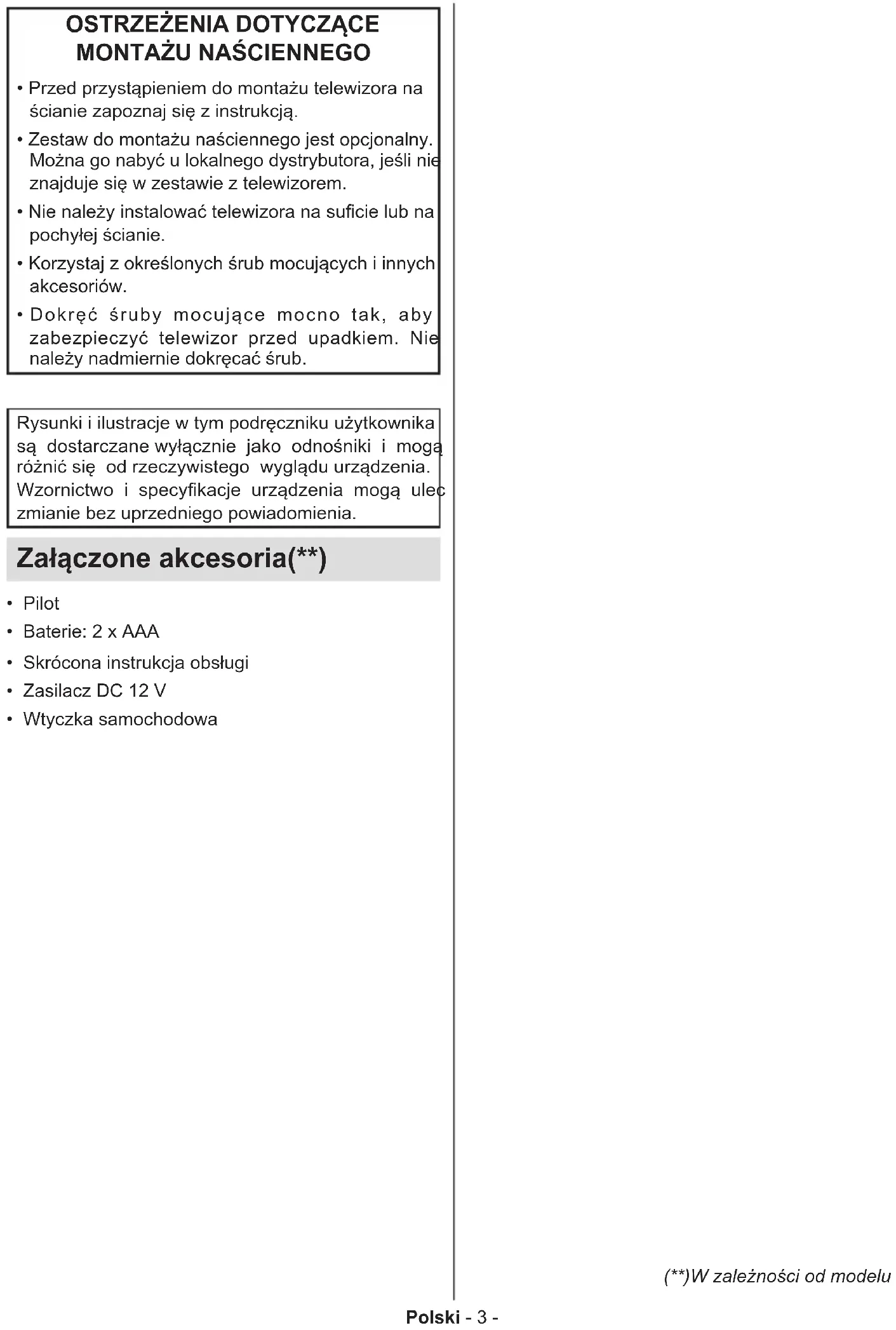 - Dokręć śruby mocujące mocno tak, aby zabezpieczyć telewizor przed upadkiem. Nie należy nadmiernie dokręcać śrub. Rysunki i ilustracje w tym podręczniku użytkownika są dostarczane wyłącznie jako odnośniki i mogą różnić się od rzeczywistego wyglądu urządzenia. Wzornictwo i specykacje urządzenia mogą ulec zmianie bez uprzedniego powiadomienia. Załączone akcesoria(**)