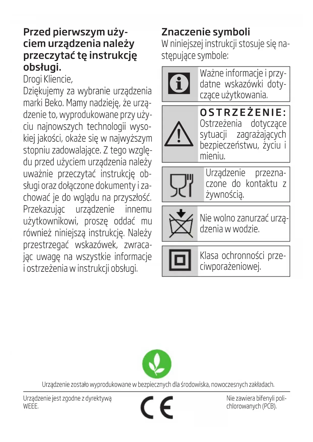 Przedpierwszymuży- ciemurządzenianależy przeczytaćtęinstrukcję obsługi. Drogi Kliencie, Dziękujemy za wybranie urządzenia marki Beko. Mamy nadzieję, że urzą- dzenie to, wyprodukowane przy uży- ciu najnowszych technologii wyso- kiej jakości, okaże się w najwyższym stopniu zadowalające. Z tego wzglę- du przed użyciem urządzenia należy uważnie przeczytać instrukcję ob- sługi oraz dołączone dokumenty i za- chować je do wglądu na przyszłość. Przekazując urządzenie innemu użytkownikowi, proszę oddać mu również niniejszą instrukcję. Należy przestrzegać wskazówek, zwraca- jąc uwagę na wszystkie informacje i ostrzeżenia w instrukcji obsługi. Urządzenie zostało wyprodukowane w bezpiecznych dla środowiska, nowoczesnych zakładach. Nie zawiera bifenyli poli- chlorowanych (PCB). Urządzenie jest zgodne z dyrektywą WEEE. Znaczenie symboli W niniejszej instrukcji stosuje się na- stępujące symbole: