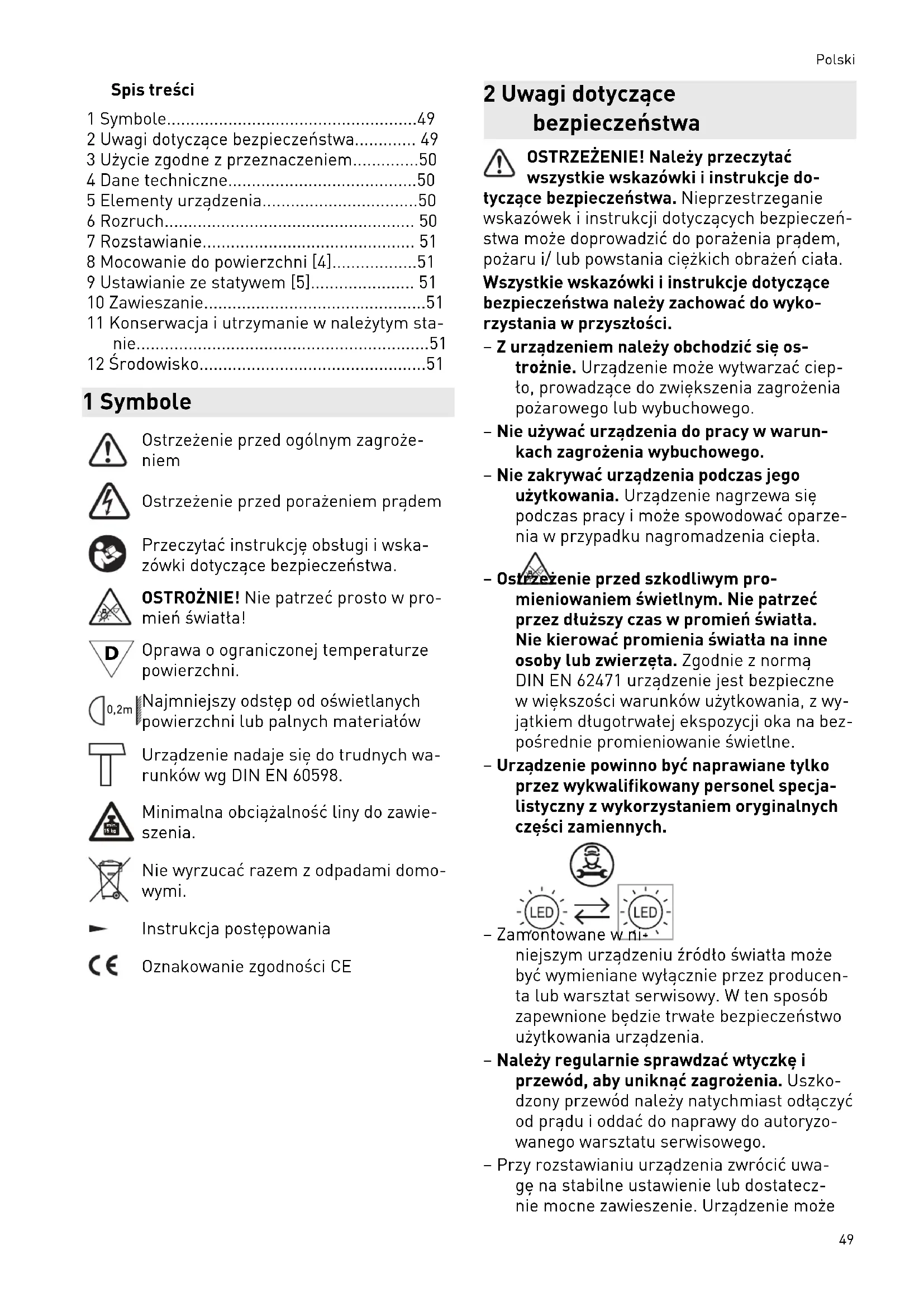 Oprawa o ograniczonej temperaturze powierzchni. 0,2m Najmniejszy odstęp od oświetlanych powierzchni lub palnych materiałów Urządzenie nadaje się do trudnych wa runków wg DIN EN 60598. min. 15 kg Minimalna obciążalność liny do zawie szenia. Nie wyrzucać razem z odpadami domo wymi. Instrukcja postępowania Oznakowanie zgodności CE 2 Uwagi dotyczące bezpieczeństwa OSTRZEŻENIE! Należy przeczytać wszystkie wskazówki i instrukcje do tyczące bezpieczeństwa. Nieprzestrzeganie wskazówek i instrukcji dotyczących bezpieczeń stwa może doprowadzić do porażenia prądem, pożaru i/ lub powstania ciężkich obrażeń ciała. Wszystkie wskazówki i instrukcje dotyczące bezpieczeństwa należy zachować do wyko rzystania w przyszłości. – Z urządzeniem należy obchodzić się os trożnie. Urządzenie może wytwarzać ciep ło, prowadzące do zwiększenia zagrożenia pożarowego lub wybuchowego. – Nie używać urządzenia do pracy w warun kach zagrożenia wybuchowego. – Nie zakrywać urządzenia podczas jego użytkowania. Urządzenie nagrzewa się podczas pracy i może spowodować oparze nia w przypadku nagromadzenia ciepła. – Ostrzeżenie przed szkodliwym pro mieniowaniem świetlnym. Nie patrzeć przez dłuższy czas w promień światła. Nie kierować promienia światła na inne osoby lub zwierzęta. Zgodnie znormą DINEN62471 urządzenie jest bezpieczne w większości warunków użytkowania, z wy jątkiem długotrwałej ekspozycji oka na bez pośrednie promieniowanie świetlne. – Urządzenie powinno być naprawiane tylko przez wykwalifikowany personel specja listyczny z wykorzystaniem oryginalnych części zamiennych. – Zamontowane w ni niejszym urządzeniu źródło światła może być wymieniane wyłącznie przez producen ta lub warsztat serwisowy. W ten sposób zapewnione będzie trwałe bezpieczeństwo użytkowania urządzenia. – Należy regularnie sprawdzać wtyczkę i przewód, aby uniknąć zagrożenia. Uszko dzony przewód należy natychmiast odłączyć od prądu i oddać do naprawy do autoryzo wanego warsztatu serwisowego. – Przy rozstawianiu urządzenia zwrócić uwa gę na stabilne ustawienie lub dostatecz nie mocne zawieszenie. Urządzenie może Polski 49spaść. Występuje niebezpieczeństwo zra nienia. – Nie używać urządzenia, jeśli jest uszkodzo ne. – Urządzenie nie jest zabawką! Trzymać urządzenie z dala od dzieci. – Lampa robocza przeznaczona jest do sto sowania w środowisku, w którym może do chodzić do osadzania się nieprzewodzącego pyłu na oprawie. 3 Użycie zgodne z przeznaczeniem Lampa robocza jest przeznaczona do wielkopo wierzchniowego oświetlania obszarów na budo wach, pomieszczeń roboczych, garaży itp. Nale ży zwracać uwagę na bezpieczeństwo miejsca podłączenia do prądu. Urządzenie nie nadaje się do oświetlania po mieszczeń w domach mieszkalnych. W przypadku eksploatacji niezgodnej z przeznaczeniem odpowiedzialność ponosi użytkownik. ZALECENIE W niektórych krajach obo wiązują dodatkowe przepisy dotyczące stosowania sprzętu elektrycznego na budo wach. Te krajowe przepisy mogą ograniczać stosowanie lamp roboczych lub nakładać na nie dodatkowe wymogi. Należy zawsze przestrze gać odpowiednich przepisów krajowych! 4 Dane techniczne Lampa robocza SYSLITE DUO Napięcie znamionowe 220 - 240 V Częstotliwość 50/60 Hz Źródło światła 80 x 1,4 W Power LED Moc maksymalna 112 W Strumień światła LED 8000 lm Temperatura barwy 5000 K Odwzorowanie kolorów RA > 80 Żywotność (L70) >10000 h Ciężar 3,4 kg Rodzaj zabezpieczenia IP 55 Urządzenie to zawiera źródło światła o klasie efektywności energetycznejE. 5 Elementy urządzenia [1-1] Zdejmowana stopka, uchwyt do nawija nia kabla [1-2] Oświetlana powierzchnia [1-3] Uchwyt [1-4] Haczyk do zawieszania na ścianie, za cisk do kabla [1-5] Przewód przyłączeniowy Podane rysunki znajdują się w załączniku in strukcji obsługi. 6 Rozruch
